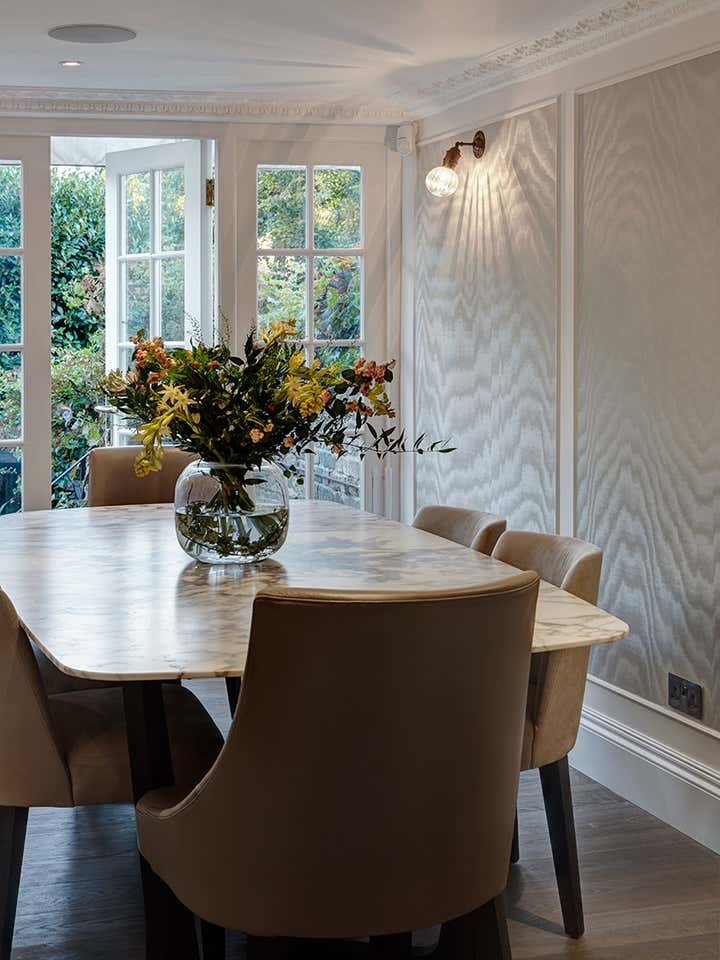 This house was given the an "Organic glam" treatment. It was important to enhance this space, but also make it homey, stylish and individual. The design has incorporated traditional elements with fashionable tones, metal inlays and Italian 1950 s lights resulting in a home full of understated glamour and soul.