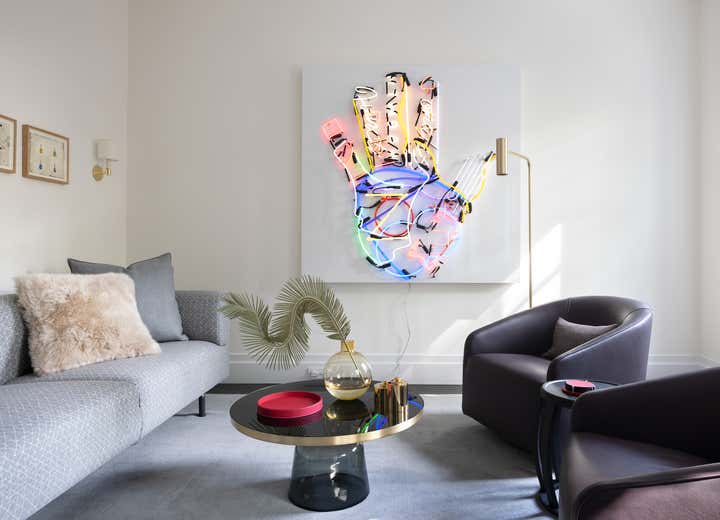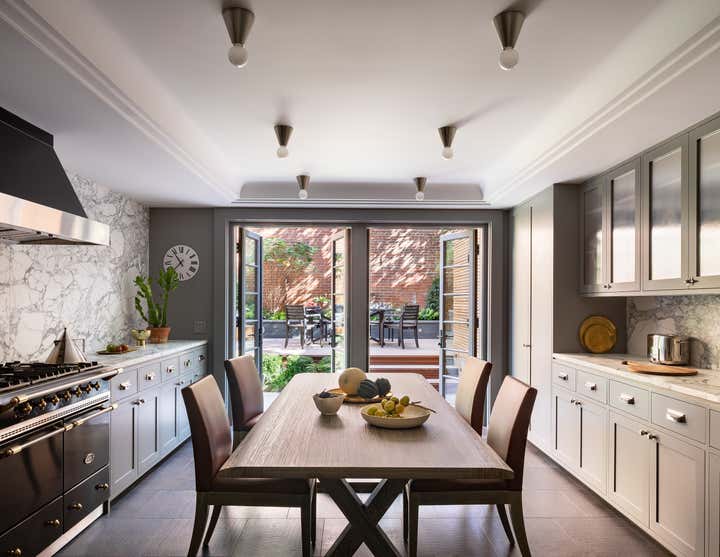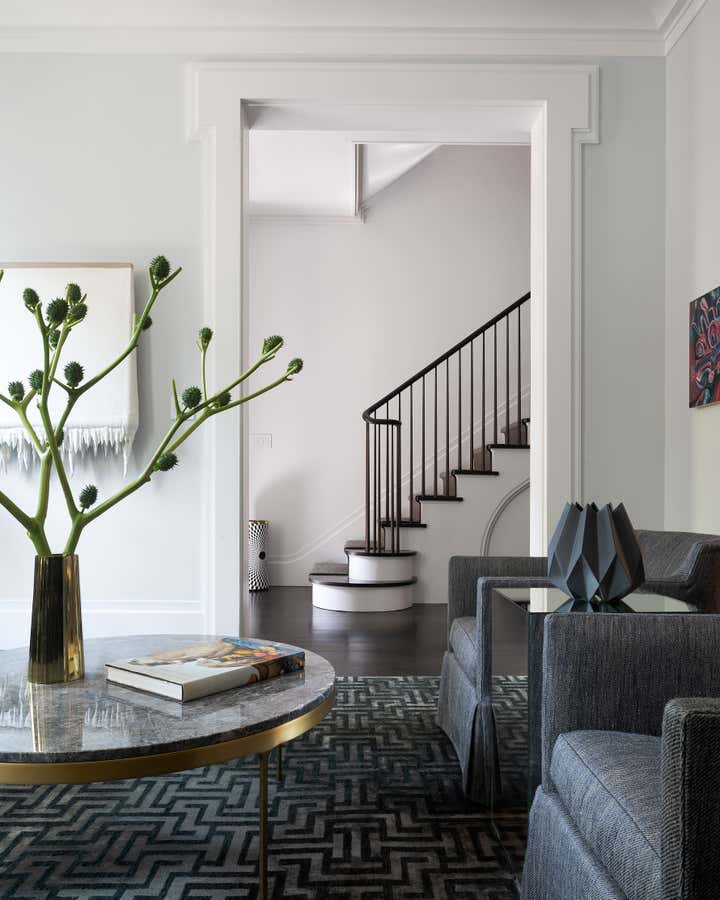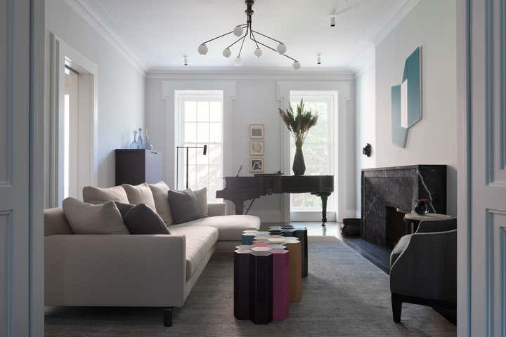This Greek Revival style townhouse built in 1834 was carefully restored and transformed for the contemporary life of an art collector. The building’s style, scale, materials, and details contribute to the special character of the Brooklyn Heights Historic District. Our design includes the addition of a rooftop room that is carefully set back from the surrounding streets to be hidden from view. A skylight at this level brings in natural light through the house and gently lights a sensuous stair. Interior details throughout the house are a simplified, pared-down expression of the house’s classical language. Visitors enter at the parlor-level into a foyer where the sculptural staircase connects five levels of the townhouse. Off the entry hall, a double parlor is designed for entertaining. Each room has a matched and figural Grigio Carnico fireplace and the large windows are fitted with carefully detailed built-in shutters. The rear parlor houses a grand piano, and both rooms are enlivened with contemporary art.