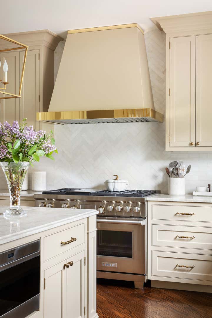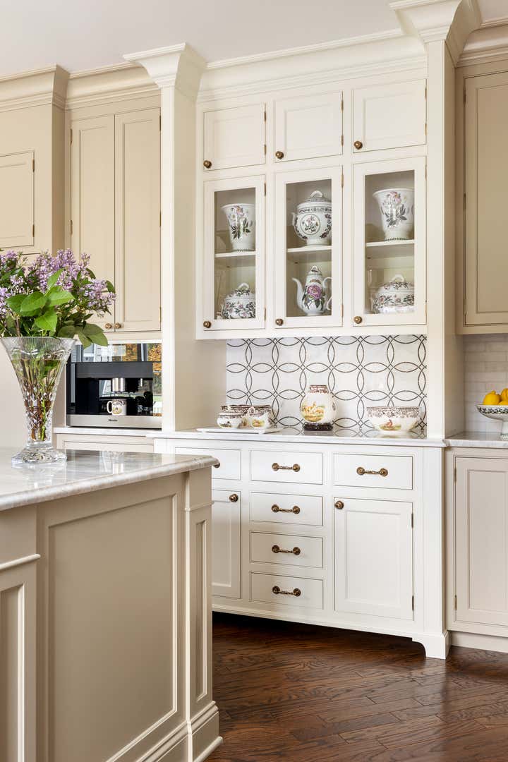 One cannot help but feel a distinct sense of serenity and timeless beauty when entering this Hamptons-style kitchen. Bathed in natural light and shimmering with inspired accents and details, this complete kitchen transformation is at once elegant and inviting. Plans and elevations were conceived to create balance and function without sacrificing harmony and visual intrigue. A metal custom hood, with an eye-catching brass band and impeccably balanced cabinets on either side, provides a strong focal point for the kitchen, which can be viewed from the adjacent living room. Brass faucets, hardware and light fixtures complement and draw further attention to this anchoring element. A wall of glass cabinetry enhances the existing windows and pleasantly expands the sense of openness in the space. Taj Mahal quartzite blends gracefully with the cabinet finishes. Cream-tone, herringbone tiles are custom-cut into different patterns to create a sense of visual movement as the eyes move across the room. An elegant, marble-top island paired with sumptuous, leather-covered stools, not only offers extra counterspace, but also an ideal gathering place for loved ones to enjoy. This unforgettable kitchen gem shines even brighter with the addition of glass cabinets, designed to display the client’s collection of Portmeirion china. Careful consideration was given to the selection of stone for the countertops, as well as the color of paint for the cabinets, to highlight this inspiring collection. Breakfast room A thoughtfully blended mix of furniture styles introduces a splash of European charm to this Hamptons-style kitchen, with French, cane-back chairs providing a sense of airy elegance and delight. A performance velvet adorns the banquette, which is piled high with lush cushions for optimal comfort while lounging in the room. Another layer of texture is achieved with a wool area rug that defines and accentuates this gorgeous breakfast nook