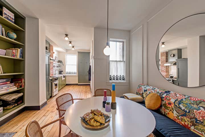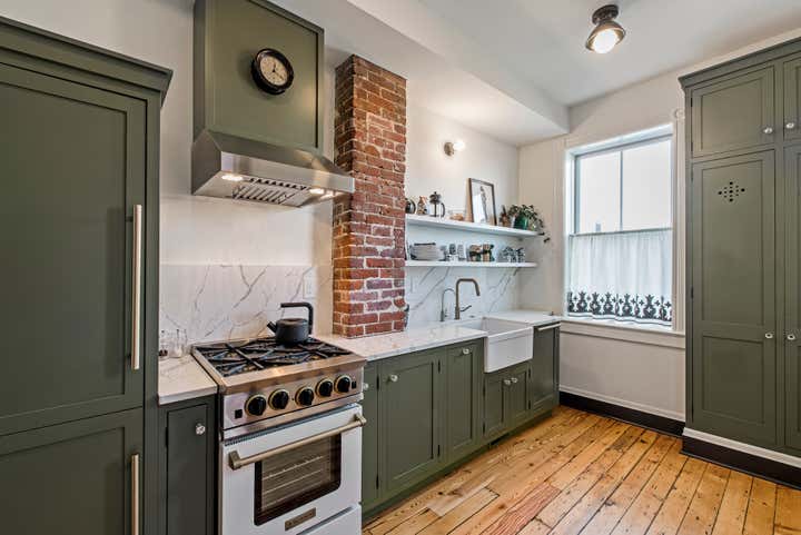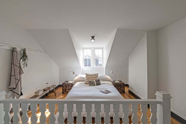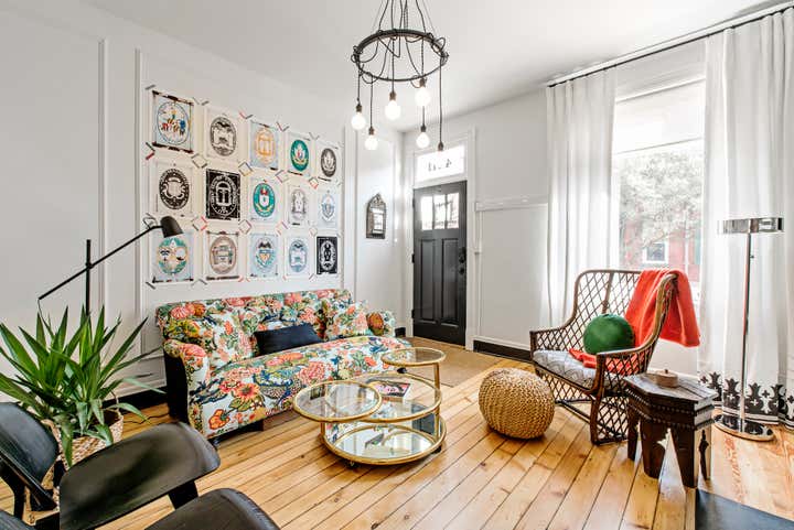 Historic renovation of a townhouse in the City of Pittsburgh. Eclectic blend of furniture compliments the exposed brick fireplaces throughout the home.
