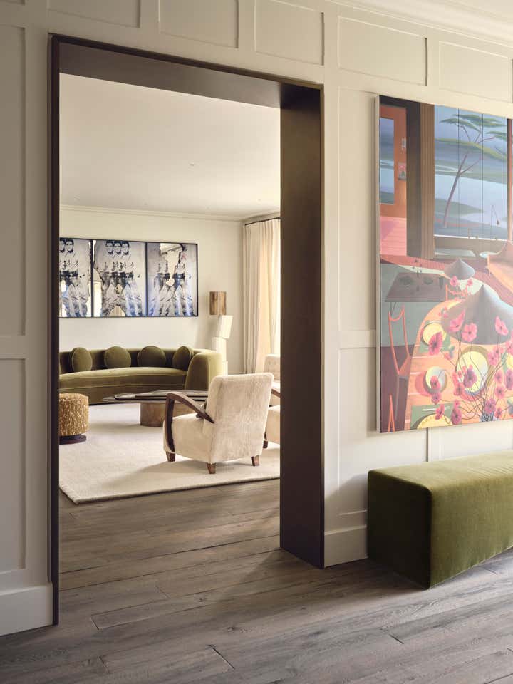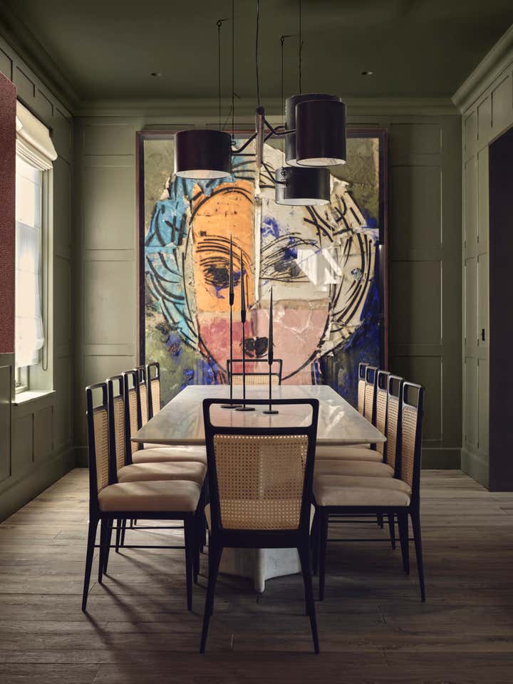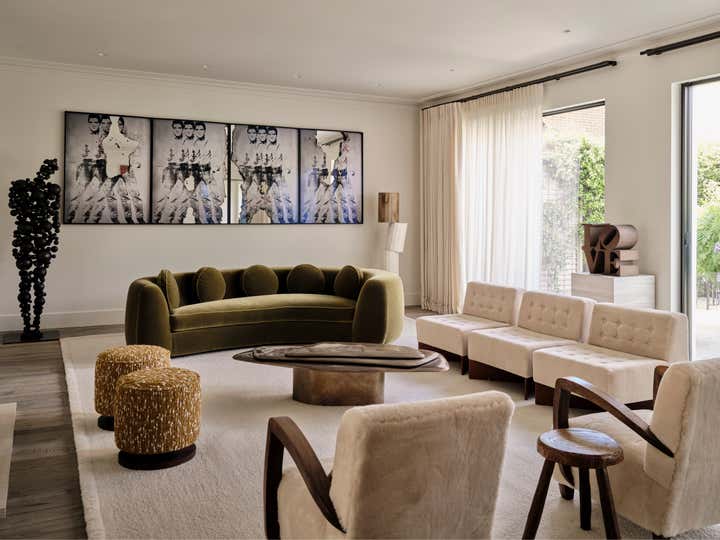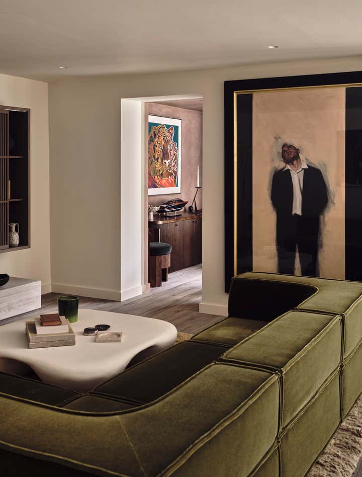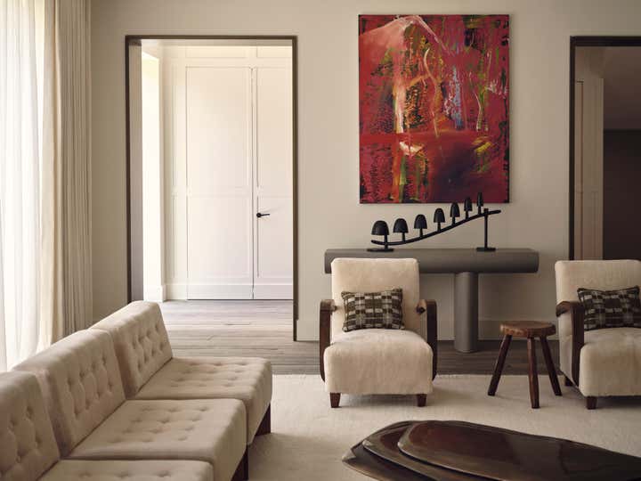 Key spaces include a garden-level kitchen opening onto a lush outdoor area, a lower-level wellness suite with a cinema, gym, pool, and sauna, and richly layered formal and informal living areas. Bespoke and vintage furnishings, including pieces by Pierre Chapo and Charles Zana, complement the bold artworks while maintaining a sense of comfort and ease.