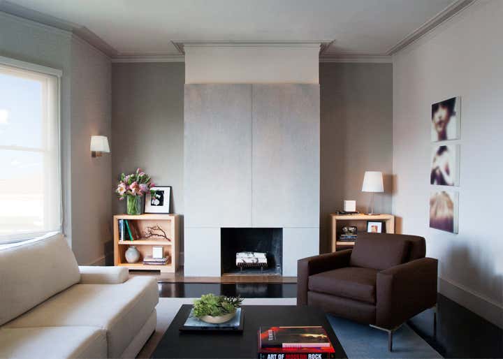 Forgoing a literal take, we introduced clean shapes wrapped in contrasting natural materials – stark minimalism kept at bay with a mix of wood, stone and tactile fabrics. White oak credenzas frame a blue limestone fireplace in the living room, fronted by a chocolate wool lounge chair. Black granite floors in the kitchen reflect the walnut cabinets above. And throughout the flat, silver gray walls mirror the fog that rolls over the hills and into view.
