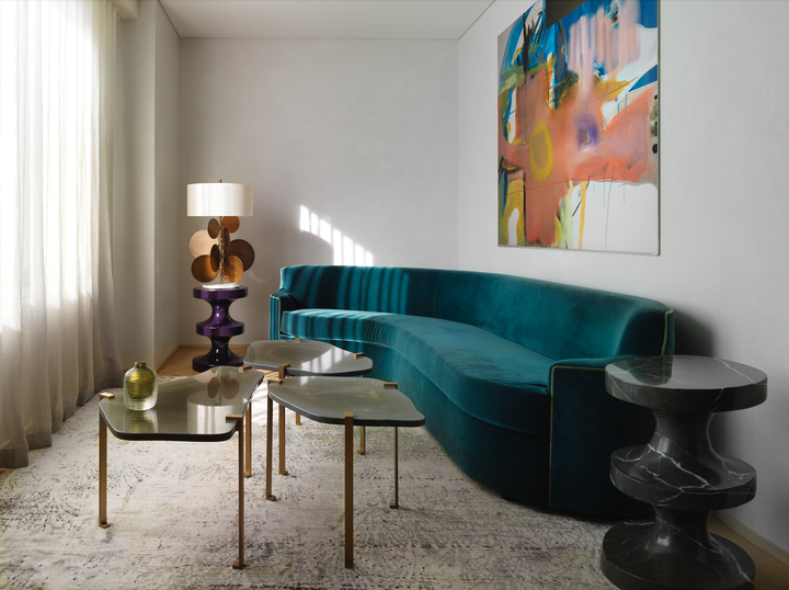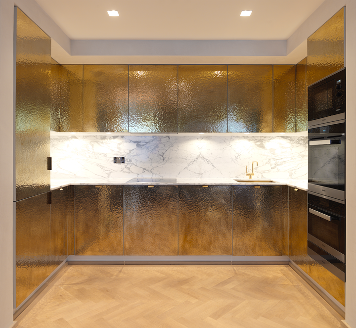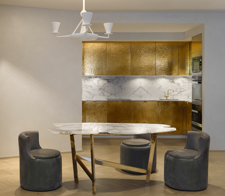 Not afraid to take a risk, the client commissioned our designs which included; an all gold silk Moire lobby, a hand hammered brass kitchen, and a selection of statement furniture.
