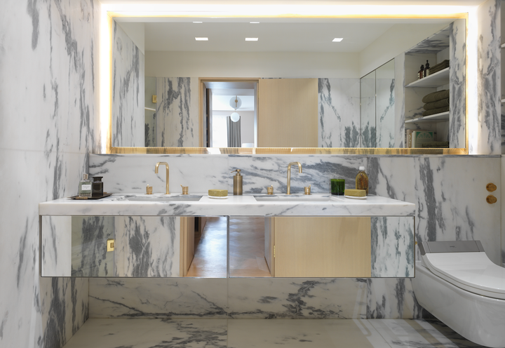 A more neutral sensibility was applied to the bedroom schemes with: muted tones, rich textures and diffused lighting. Detailed oak joinery increased storage throughout, and the master dressing room was expanded and redesigned with custom brass fittings. The bathrooms were fully redesigned to make use of lost space.