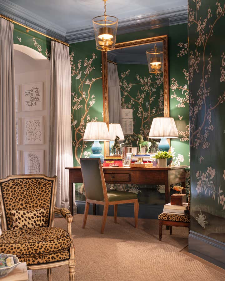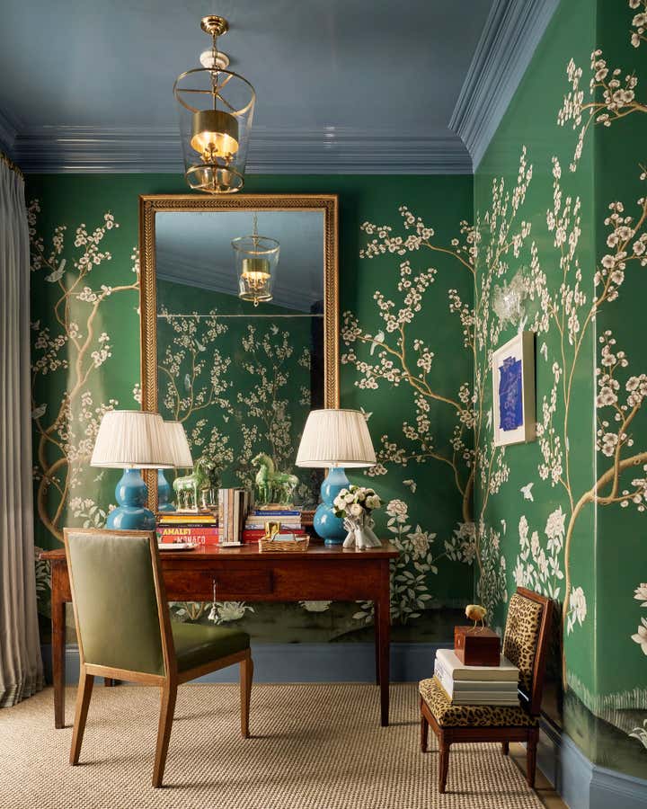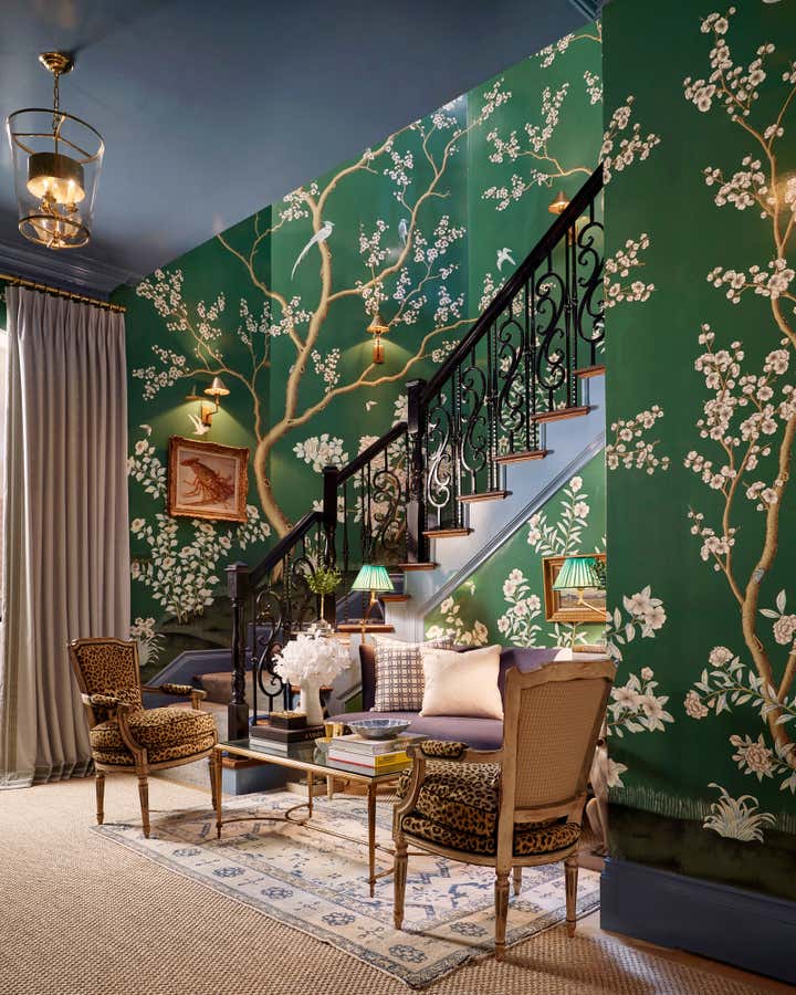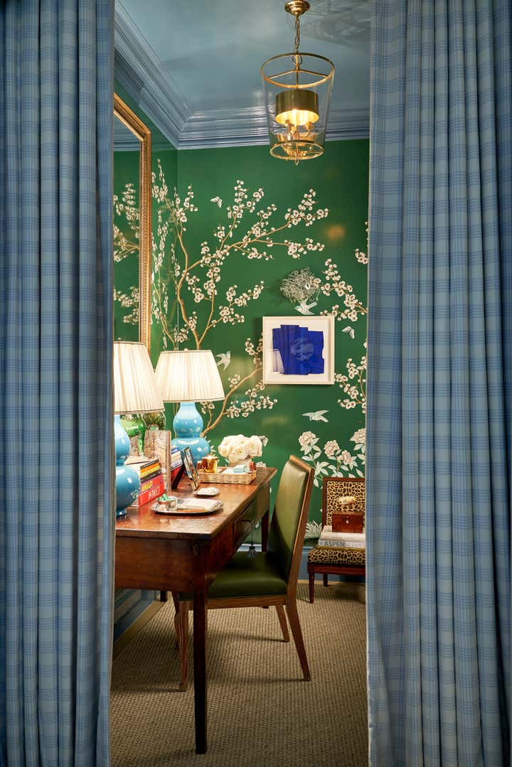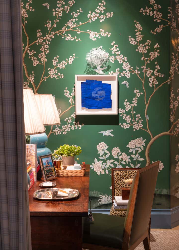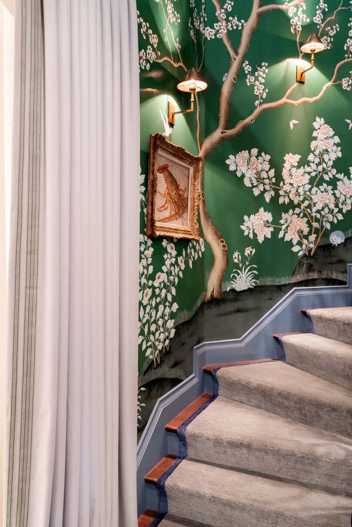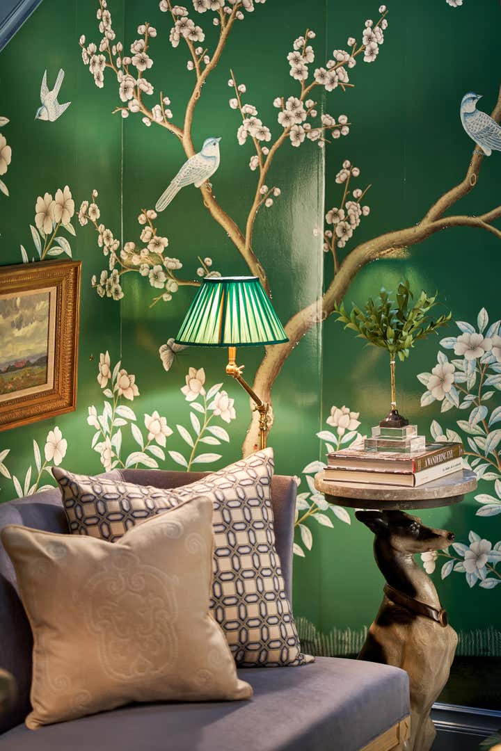 The Back Staircase and Downstairs Landing, named Emerald Garden, is designed by Melissa Morgan of M Interiors in San Antonio, Texas. Morgan’s design seeks to serve as more than an area of transition, but, rather, as a place for tranquility and reflection. She said, “My aim was to elevate this space and make it a celebrated destination that can serve as the heart of the home and have meaning, rather than merely connect one to other spaces in the house.” Her choices of unique furnishings and accessories, a blending of new pieces with antiques, stylish textiles, and a mix of contemporary and classical art, highlight an appreciation for detail and the ability to create a timeless aesthetic. Emerald Garden references the magnificent, custom wallcovering by Gracie Studios. Applied to walls and up the stairs, the saturated green is balanced with deep blues against flowering trees. A joyful cast of characters--birds, cicadas, woodpeckers, hedgehogs, daisies, ladybugs, bees and butterflies, favorites hand-selected by Morgan, punctuate the background. Richly detailed and sweeping in scope, the surface offers a delightful storytelling component, and the application of lacquer, an added sheen.