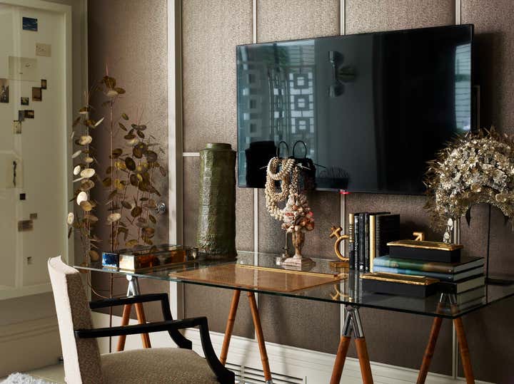 The result, a modern boudoir, offering a sense of theatre and old Hollywood glamour with plush and sumptuous fabrics. The space was brought up to date stylistically, by using contemporary furnishings and art with a strong retro element. Mirrors were used for both function and utility, increasing the scale and grandeur of the space.
