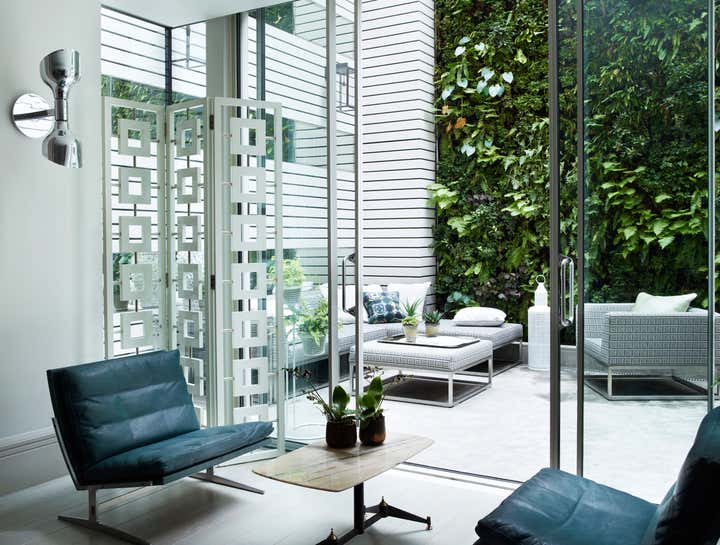 The property was completely gutted, the interior architecture redone to maximize on light and function, allowing each room to be open to the next and subsequent rooms or cleverly closed off for privacy. Full height sliding glass doors offer versatility and the ability for seamless interaction from the outdoor terrace with its living green wall to the indoor sitting area, also flooding the entire space with natural light.