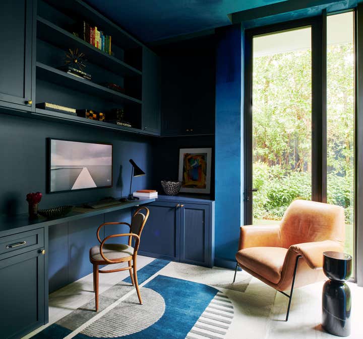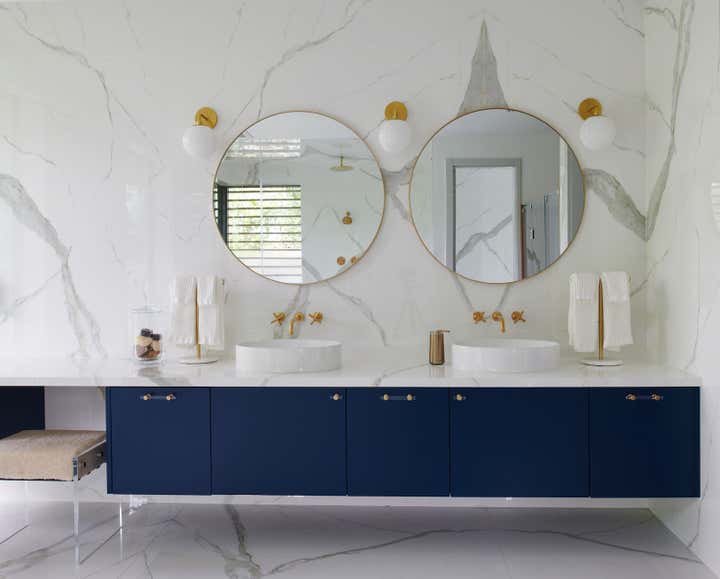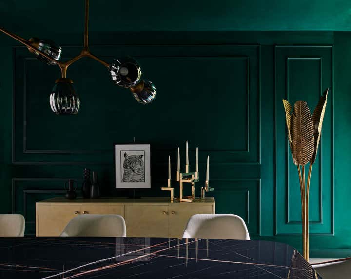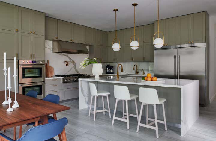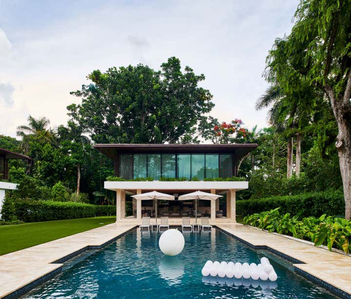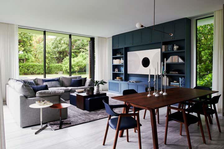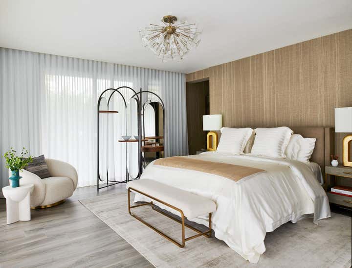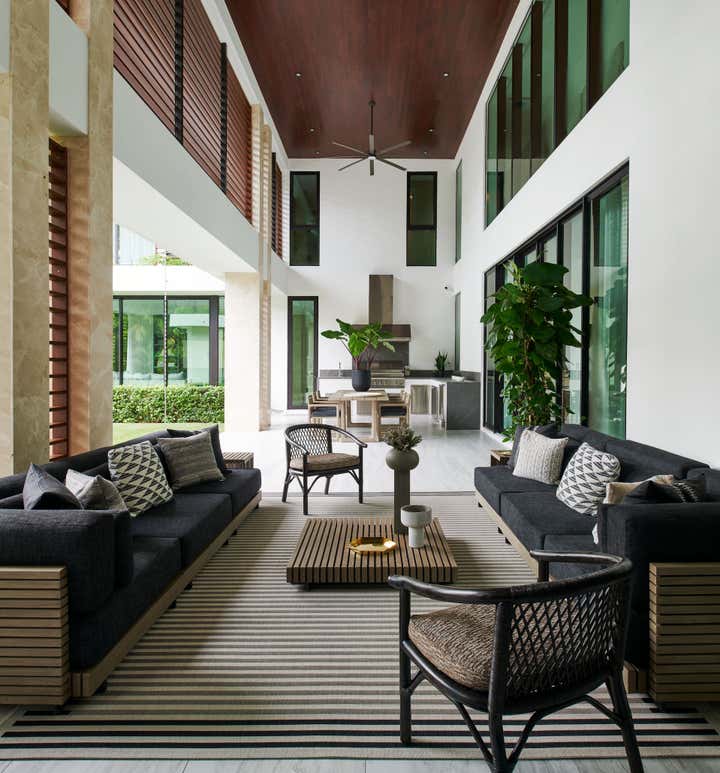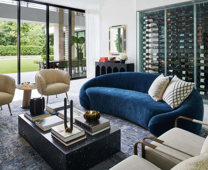 Designing a modern house for a young tech-savvy international couple with small Assure provided a full consulting package working with the architect, designing all the interiors including the kitchen, lighting, and sourcing. Modern interiors with warm elements come together in a fresh and welcoming way. Throughout the house, the Studio introduced an earthy palette with neutral hues, layering texture, and interest via tactile materials such as linen, boucle velvet and accent colors in greens and blues. These elements were conceived as part of a laidback and refined decorating scheme suitable for tropical living. The light-filled living room, originally conceived as an open space, was divided by a wine wall at the client’s request for a more formal dining area. The glass wine cellar creates a separate dining room while maintaining a feeling of openness. The wall holds 200 bottles in a temperature-controlled environment. The dining room seats eight to ten comfortably. Assure applied Malachite green suede to the ceiling, moldings, and walls to create an intimate and elegant environment for evening entertaining. The stripe wool silk rug from the Rug Company adds a graphic pop and armchairs from Poltrona Frau inject tactile color leather which stands out against the dark walls. The upstairs primary bedroom was designed as a large suite with a separate seating/ TV area behind the bed and a large spa-like primary bathroom. In the bedroom silk blend wallcovering creates a cocooning backdrop with the coziness enhanced by a silk rug and silk bedding from British brand Gingerlily. The dramatic Fendi mirrored screen creates privacy and functions as a dressing area. children who sought a serene interior which balanced home life, work, and entertaining.