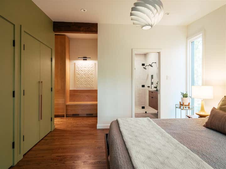about preserving its ethos. The project reconfigured the home’s spatial organization and refreshed the principal living spaces, kitchen, and primary suite, all while respecting the home’s vernacular midcentury form. The