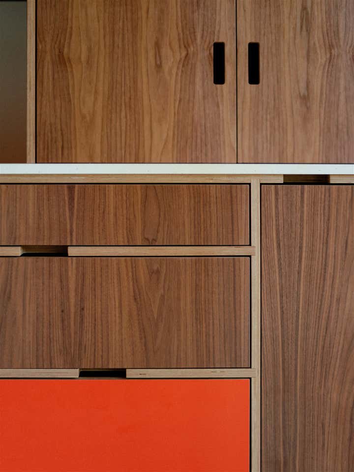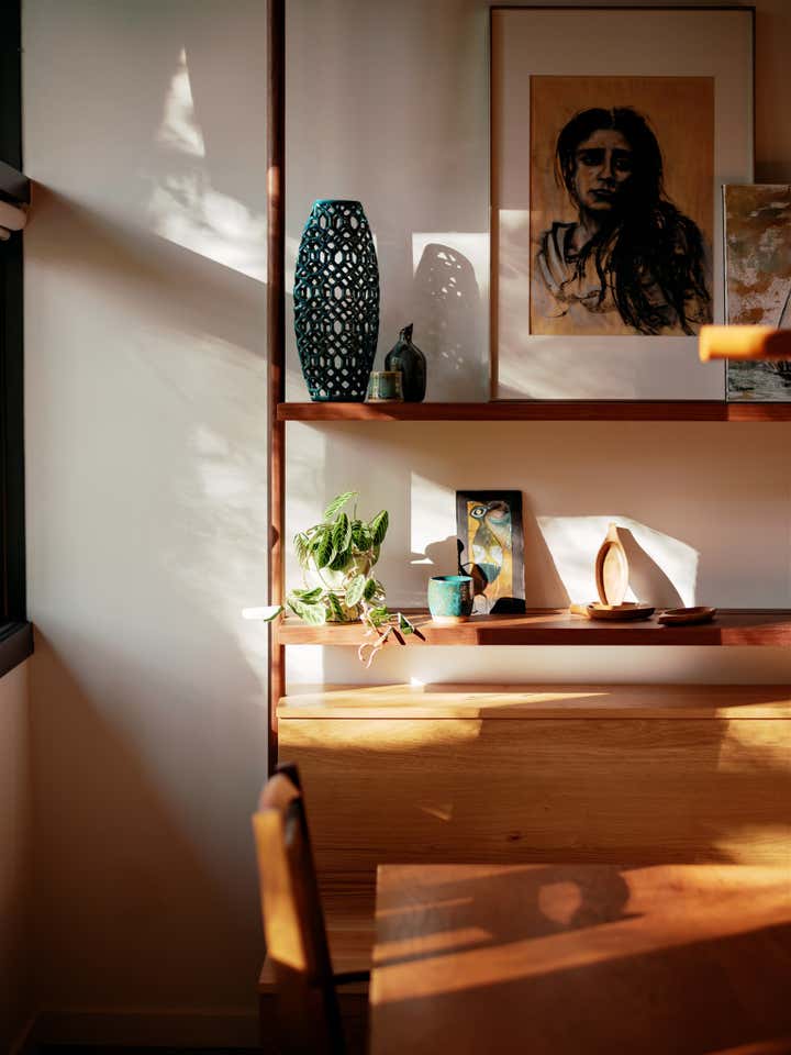 original roof line, exterior wall locations, and glazing were all preserved as part of the renovation process. Inside and out, the home is anchored by a bold, cohesive palette of color, material, and texture.
