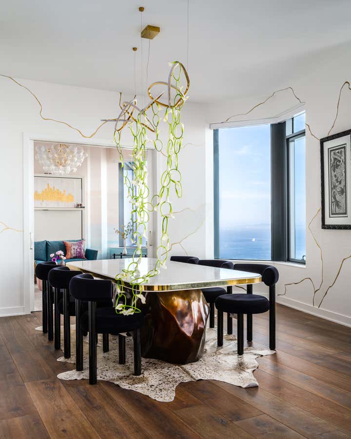 Via furnishings with architecturally ”organic” silhouettes, ironically inspired by inorganic forms in nature (boulders and rock craggles), we brought to life a quietly artful home that softens the angularity of their building and the built environment it looks onto. Custom furnishings and swirling lightforms join sprawling gold linework and peekaboo crocodile-print plasterwork by Caroline Lizarraga, to tell a boldly monochromatic story of the creativity and shared love of hosting of this beautiful family.