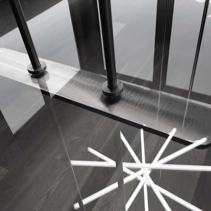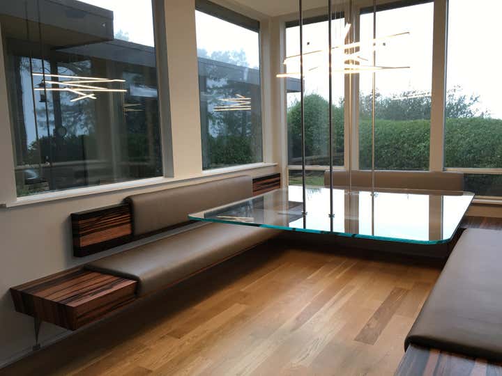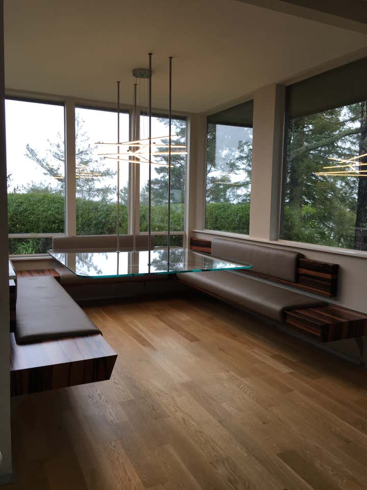 The design epiphany was to suspend a glass table over wall hung benches made of Koa and leather. The stainless plates and anchoring support of the glass were custom designed as was the steel brackets installed in the ceiling.