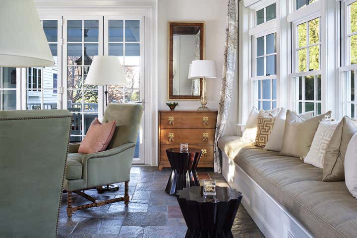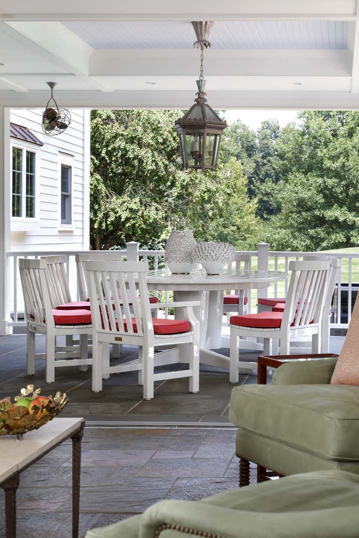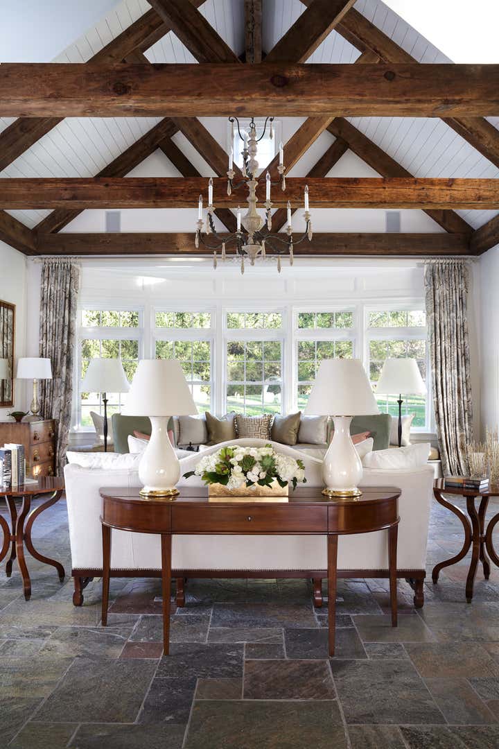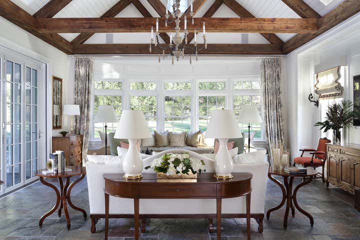 This ASID Award-winning sunroom inspires a sense of freshness and vitality. Artful furniture selections, whose curvilinear lines gracefully juxtapose the strong geometric lines of trusses and beams, reflect a measured study of shapes and materials that intermingle impeccably amidst a neutral color palette brushed with celebrations of coral and master millwork. Radiant-heated flooring and reclaimed wood lend warmth and comfort. Combining English, Spanish and fresh modern elements, this sunroom offers captivating views and easy access to the outside dining area, serving both form and function with inspiring gusto. A double-height ceiling with recessed LED lighting concealed in the beams seems at times to be the only thing tethering this airy expression of beauty and design excellence from floating directly into the sky.