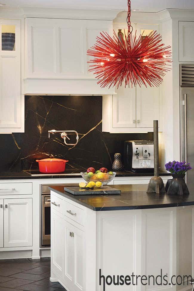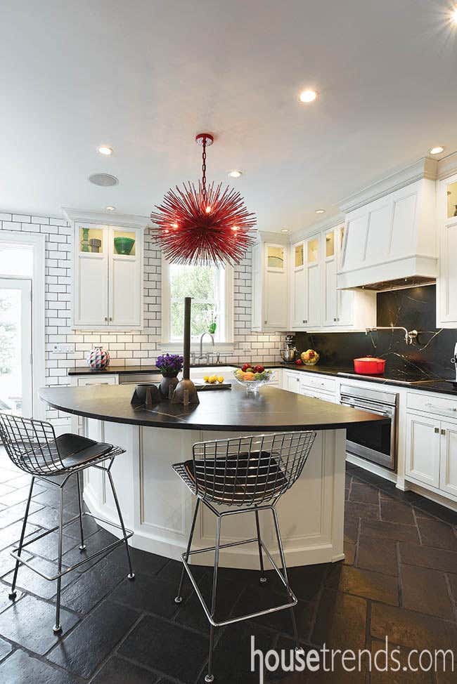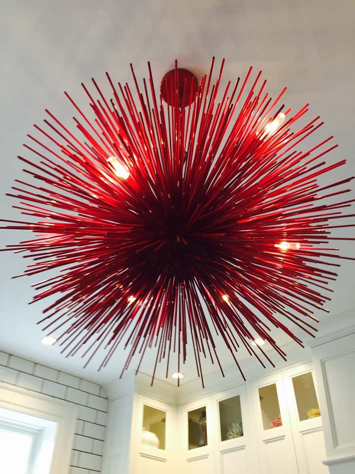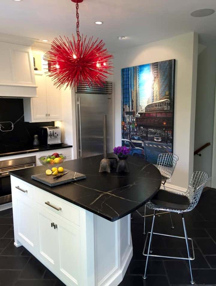 This was a complete overhaul and redesign of the functional kitchen space of this early 20th century Victorian Foursquare on the park. From the custom cabinetry to the striking crimson red Jean De Merry chandelier over the island to the handmade french terra cotta floor this family kitchen serves modern artful vibes and created a vibrant and joyous hub for this families life.