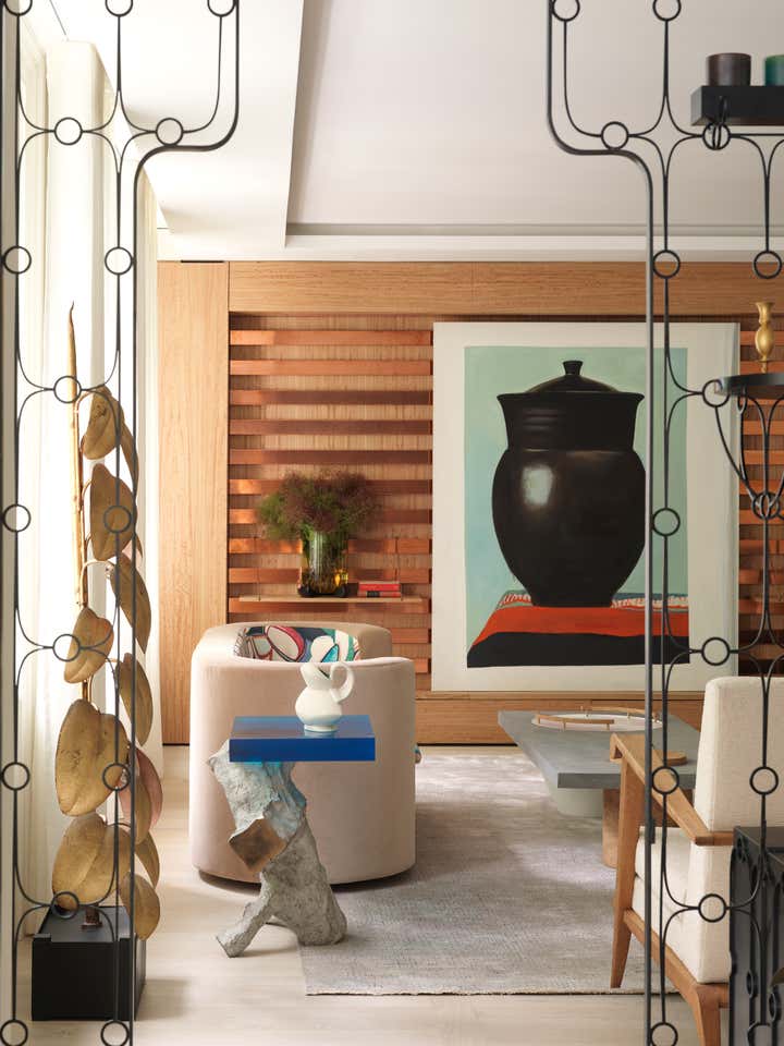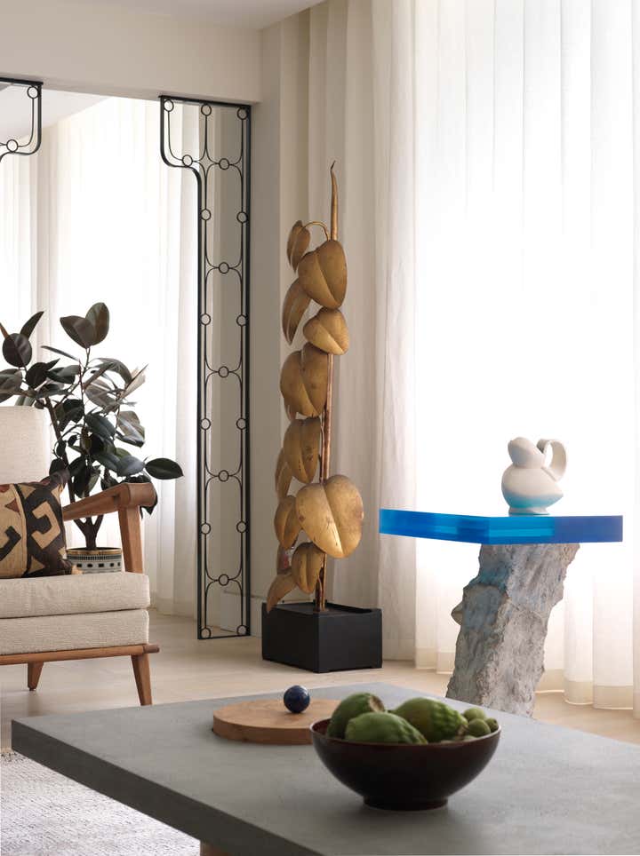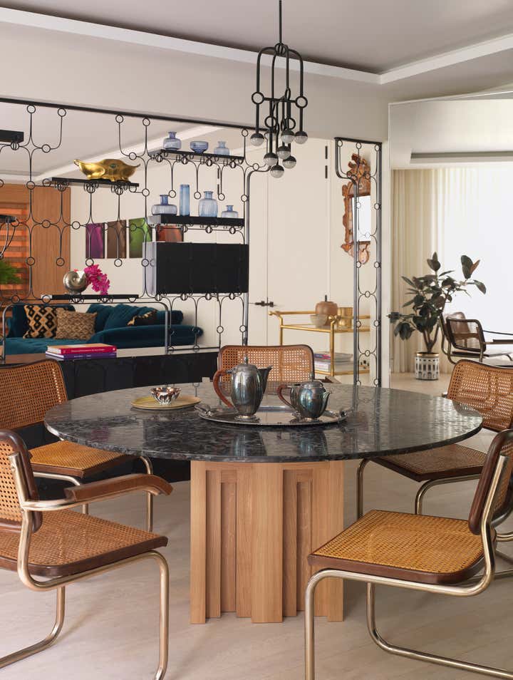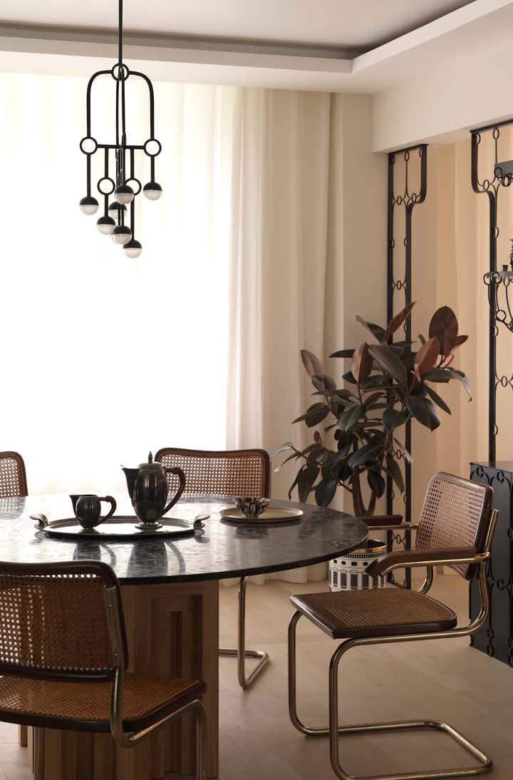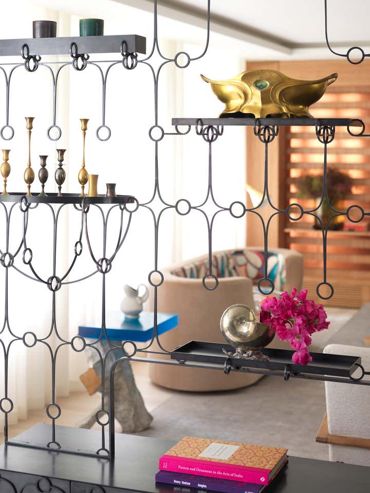 A narrow, rectangular room houses the kitchen, dining, and living room with an open plan layout. An iron screen was designed to partition the room to segregate the kitchen and dining space from the living area. The screen increased functionality by adding storage and shelving whilst still allowing for a visual continuity of the space.