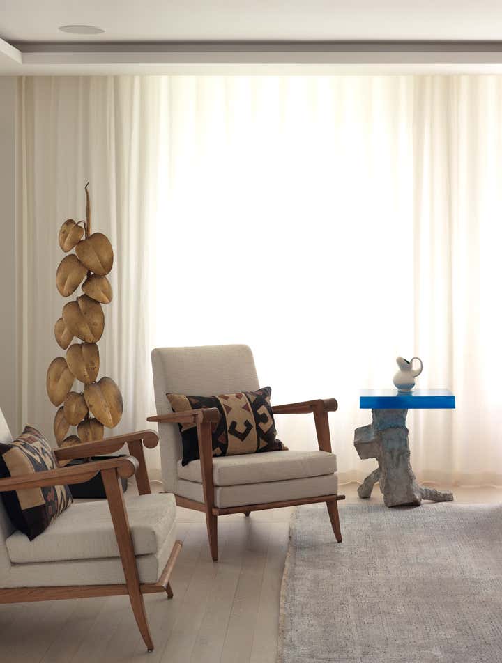 Respectful of the already fitted interior, we made minimal changes to the structure and layout. Instead, playful character was added throughout the apartment with illustrative wallpapers, patterned upholstery and bold furniture.