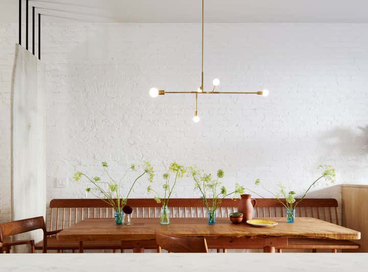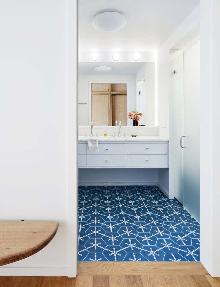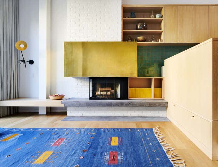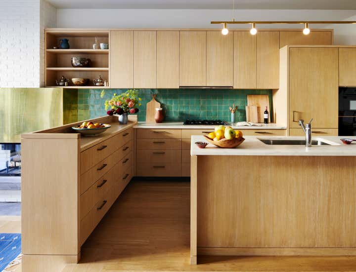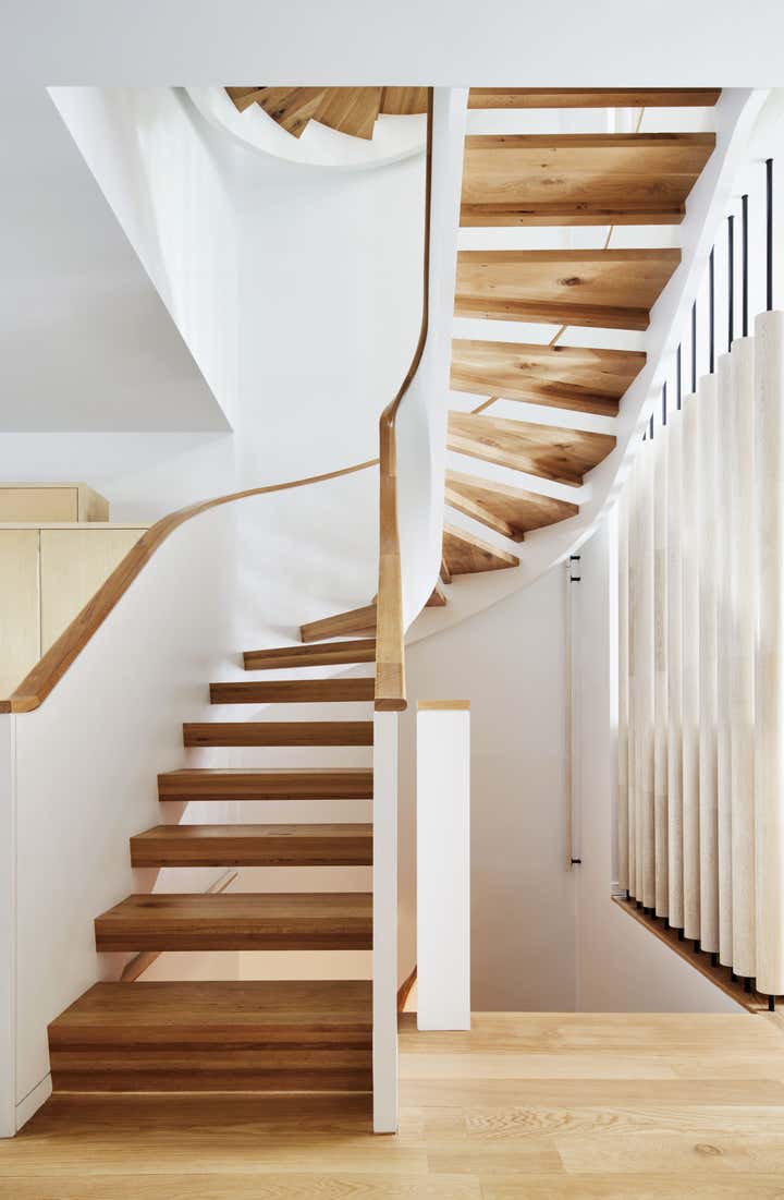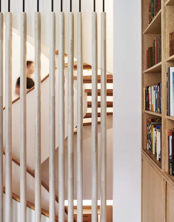 Oak finishes act as a unifying material throughout the house and are bleached relative to the stair. We sustained rigorous millwork through the building’s cabinetry, shelves, bookcases, benches, cubbies, vanities, pocket doors, kitchen island, and privacy screens.