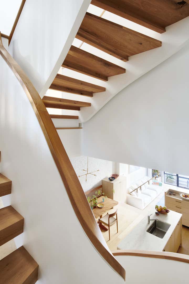 Prior to our rehabilitation, the building lacked natural light and connection with exterior spaces. We designed an open sculptural stair tower, which we extended beyond the original roof level into a new penthouse and rooftop terrace. A free-form bench sits suspended over the stair tower, adjacent to the new roof deck.