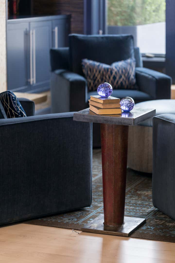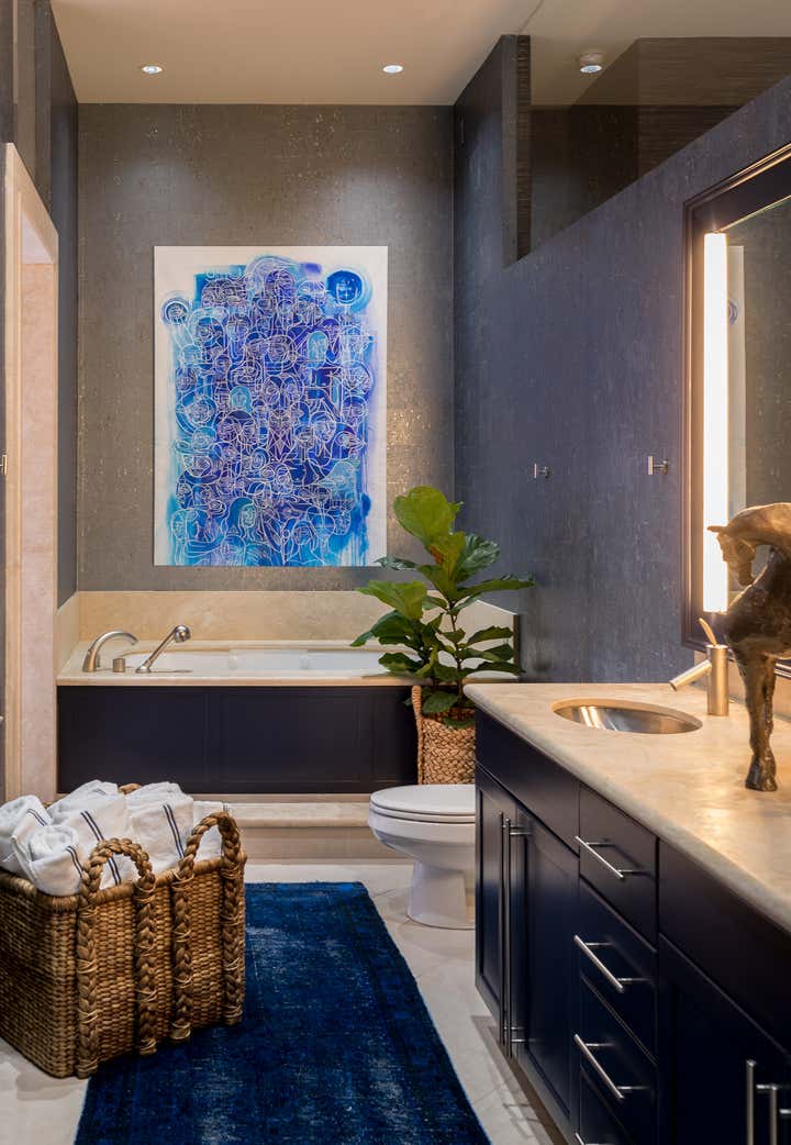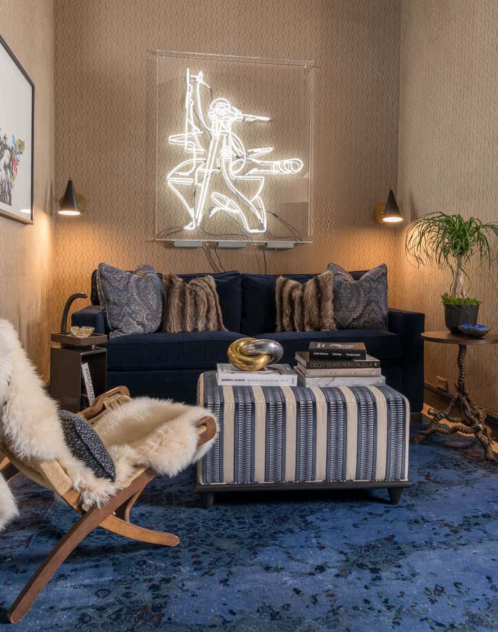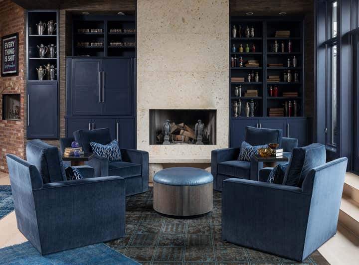 Having purchased this penthouse a few years ago, our client came to us to redefine the space with sophistication and an urban vibe. A key component to the design was the incorporation of pieces from their extensive modern art collection. Each room is anchored with a major art piece, and the art truly drove our design vision. In the foyer, we displayed an original artwork by D*Face, prominently placed above an industrial console and flanked by a pair of vintage 1970’s lamps. A large Anthony Lister painting anchors the living space and pairs perfectly with custom graphic game chairs, steel tables, layered rugs and lapis grasscloth. In the television room, a neon sculpture by Doze Green illuminates the cozy space. Finally, we finished the project with a custom mural which floats on an original antique brick wall in the master bedroom. The penthouse is located on the historic Fayetteville town square and has an expansive view of the University of Arkansas and its iconic building, Old Main. From all elements used, we truly brought an urban penthouse to a sleepy college town in Arkansas.