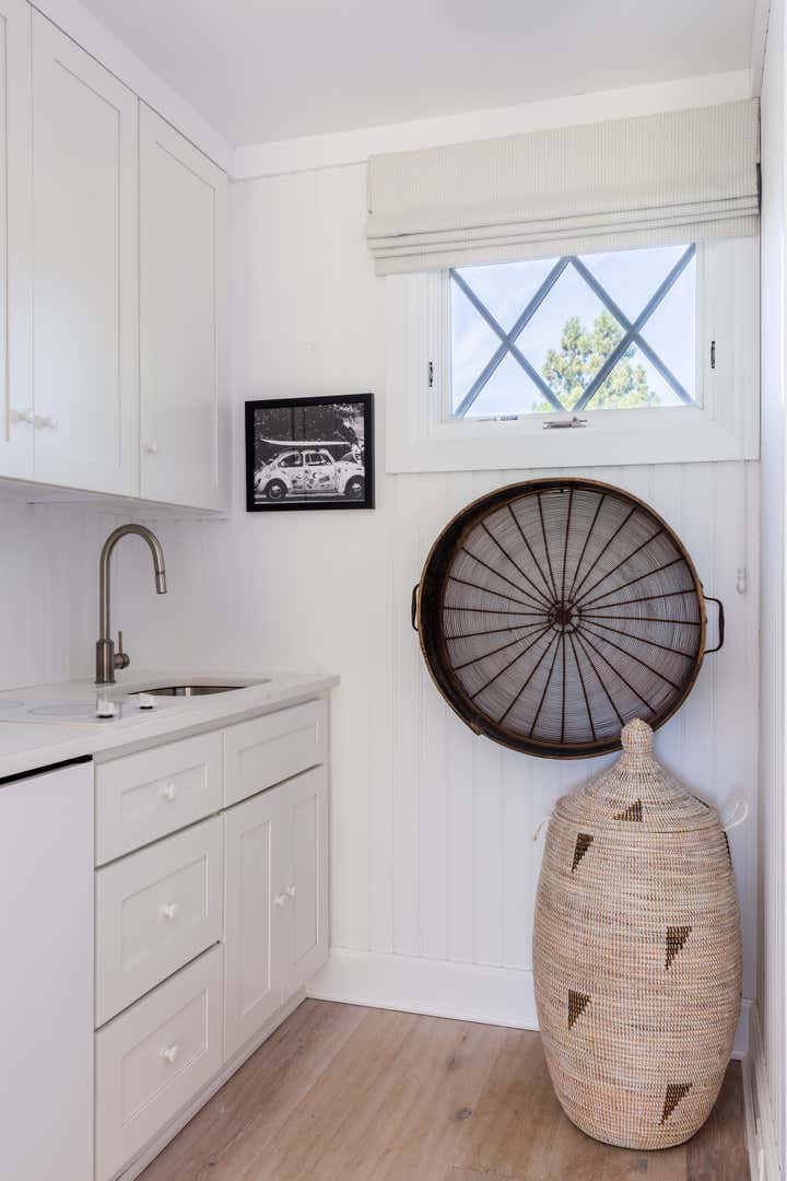The guest house is a light and accessible space, meant to be a place for relaxation which drew inspiration from the beach town aesthetic. The blue and white palette, seagrass rug and wainscot walls remind the guests that are relaxing ocean side.