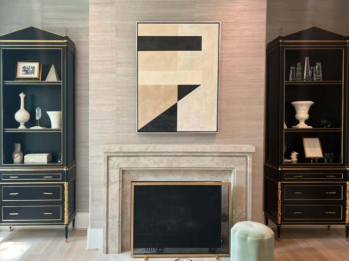 A silver grass-cloth serves as the ground for this eclectic sitting area and balance is struck by a geometric plaster art piece centered between Neoclassical cabinetry.