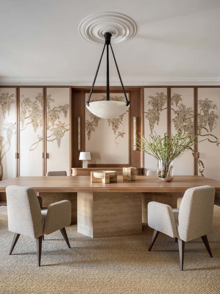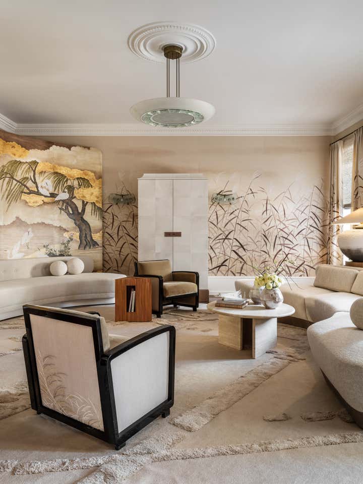 Into the mix, Irakli has teamed seductively curved sofas and armchairs with triangular side tables, abstract bases for both dining and coffee tables, and rough, bulbous table lamps (all exclusively created by the designer for the space) with vintage lighting by French designer Max Ingrand (once artistic director of FontanaArte). “A little bit of asymmetry adds life to a space,” he enthuses.