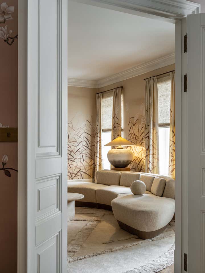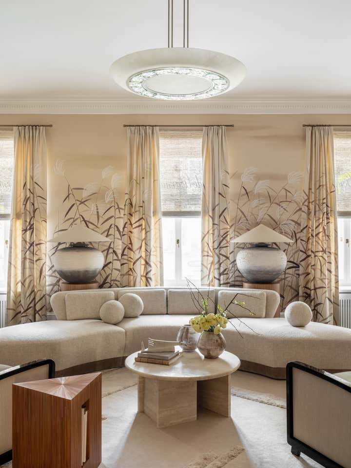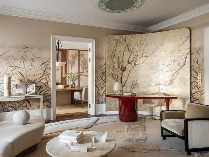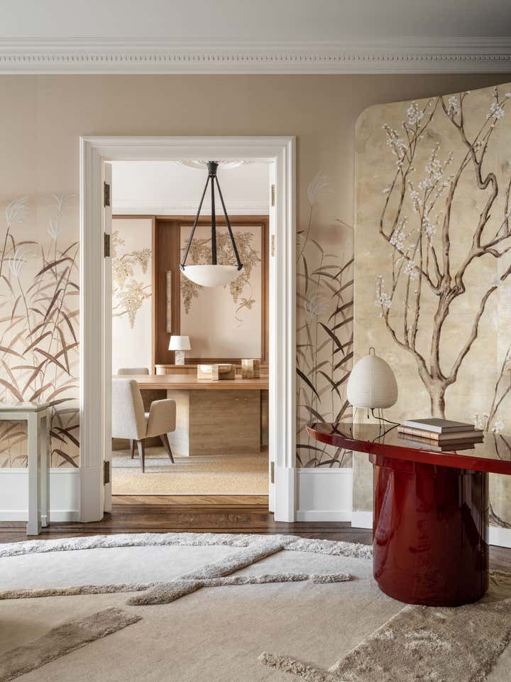 For the showroom, Irakli has designed a subtle, soothing ‘Wild Grasses’ panoramic, revised from a pattern he first created with de Gournay for a residential project in Moscow. Originally inspired by an image of an 18th century Japanese Edo period screen, Irakli has taken the motif of towering obana grasses, complete with delicate feathery ‘tail heads’ dancing in a gentle breeze, and created a new pattern which he has swathed across both walls and curtains, enveloping the room in sumptuous silk.