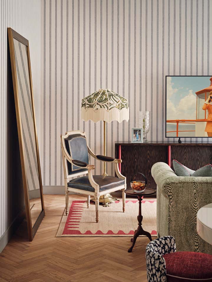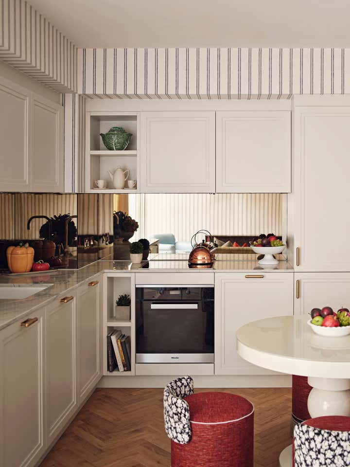 Laura Marino for Studio L, London (or Studio L for short) transformed a standard one-bedroom apartment in a newly built central London residential block into a stylish, sartorial retreat inspired by André 3000’s dapper fashion, the playful energy of Outkast’s song “So Fresh, So Clean,” and a touch of Wes Anderson’s whimsy. The result is a memorable 700-square-foot apartment filled with joyful flair and panache.