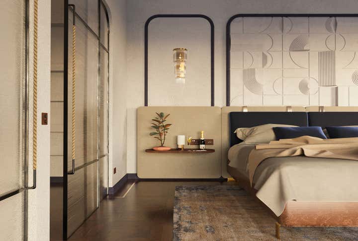 Whole interior keeping in a neutral sand colour scheme with navy-blue accents. Above the gorgeous bed is a 3D art installation. American walnut floor with gold border giving unbelievable effect.