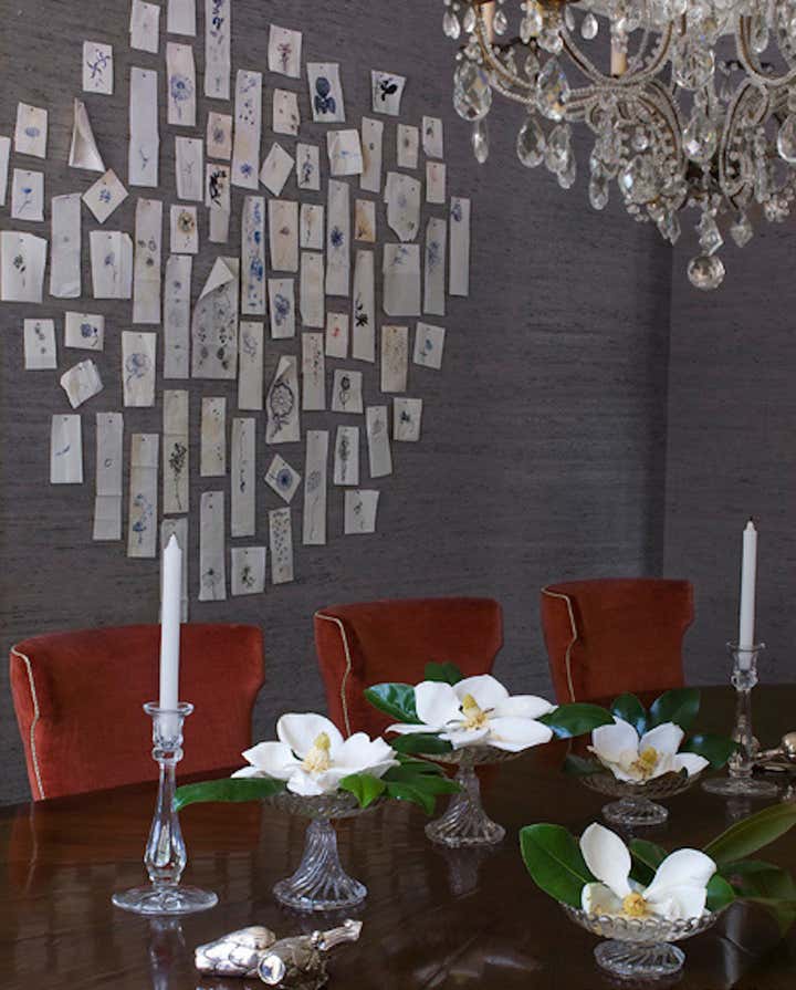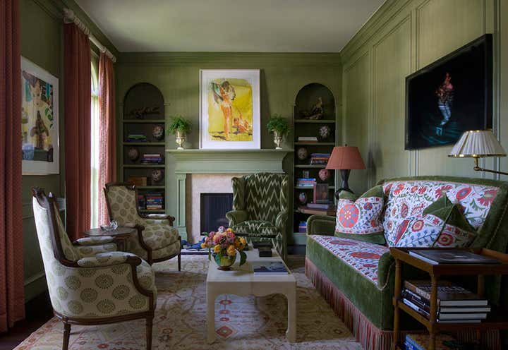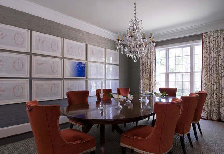 This project shows how contemporary art can be complimented by traditional decorating. The dining room showcases works by Jim Hodges and Louise Bourgeois, and the family room features a Damien Hirst painting over the mantel.