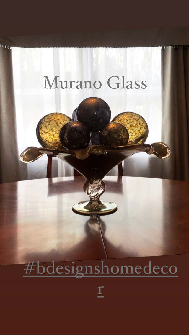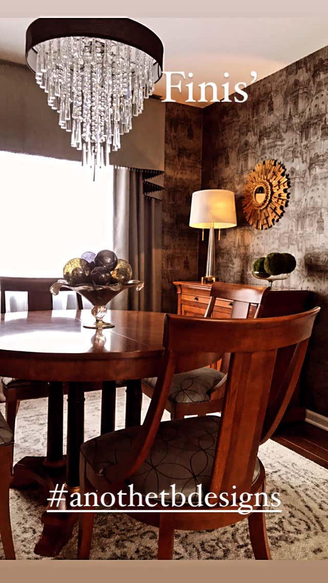 Susan s a long time client and I had been bugging her to update her Dining room, for a while now. She has a penchant for black, modern and unique pieces, but somehow her dining room lacked that personality. We saved the wall Paper and dining Furniture to work with and changed out everything else. The Chandelier was the first thing to go along with the wall to wall carpet which we gutted and replaced with hardwood through out the home. You can see here we added a nice low profile are rug that compliments the space nicely. We also designed new Custom Window Treatments, a modern twist on a classic Design. Susan doesn t like flowers, so to add color, texture and dimension, we used green moss Balls and Murano Glass. The centerpiece is a Murano Glass pedestal Bowl, that we filled with black and Gold Murano glass balls for height. I particularly love the table scape on the side board, along with the Gold Starburst Mirror and Crystal Table Lamp.