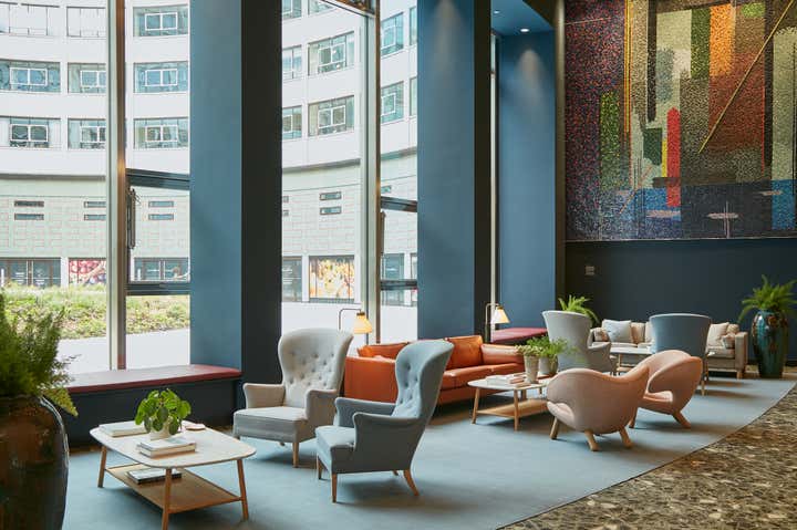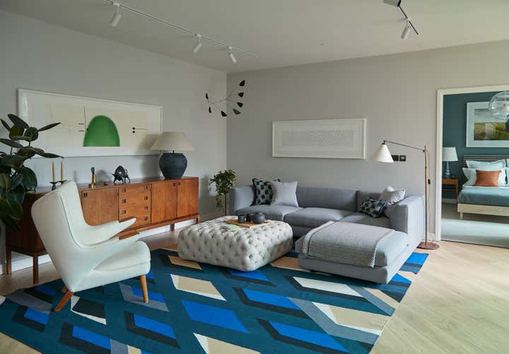 A major project to transform the former BBC Television Centre, creating new communal spaces and a collection of comfortable, relaxed show apartments. We were brought in by the developer of the Grade II-listed BBC Television Centre to transform it from a corporate environment into a comfortable, liveable building for the 21st century. There were two distinct aspects to the project: first, to create a series of relaxed communal areas for residents, including a lobby, lounge, library and screening room; and second, to design several show apartments in the iconic circular Helios building. It was important to honour both the original 1961 architecture and new additions made by Allford Hall Monaghan Morris (AHMM). On our residential projects, we normally spend time getting to know the client, but this required a different approach. We had not one real-life homeowner, but many potential homeowners. It was vital to make the apartments feel warm, friendly and personal, with plenty of human touches. To achieve this, we used classic 1950s Scandinavian furniture that echoes the midcentury architecture, and brought in tactile accessories to avoid the static feel commonly associated with show flats. Among these are bespoke geometric rugs by Vanderhurd (inspired by the patterned ceilings in the Helios building’s lobby), vibrant artworks and lots of plants to soften the rooms.