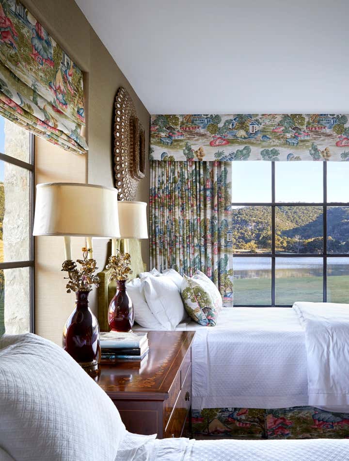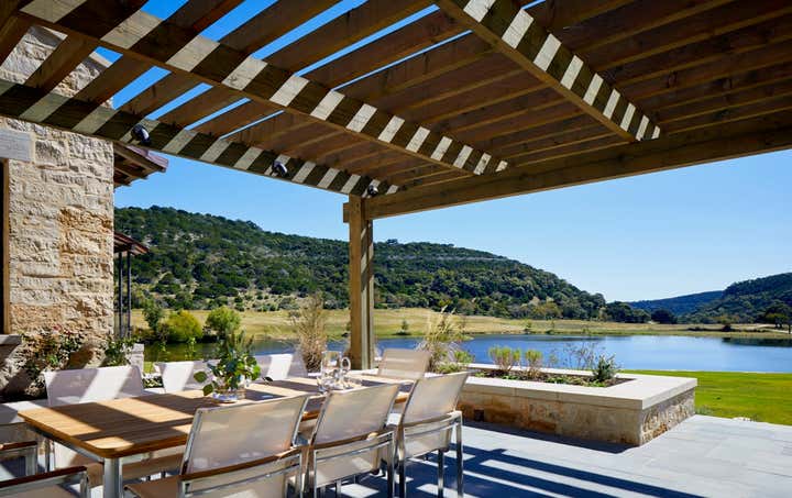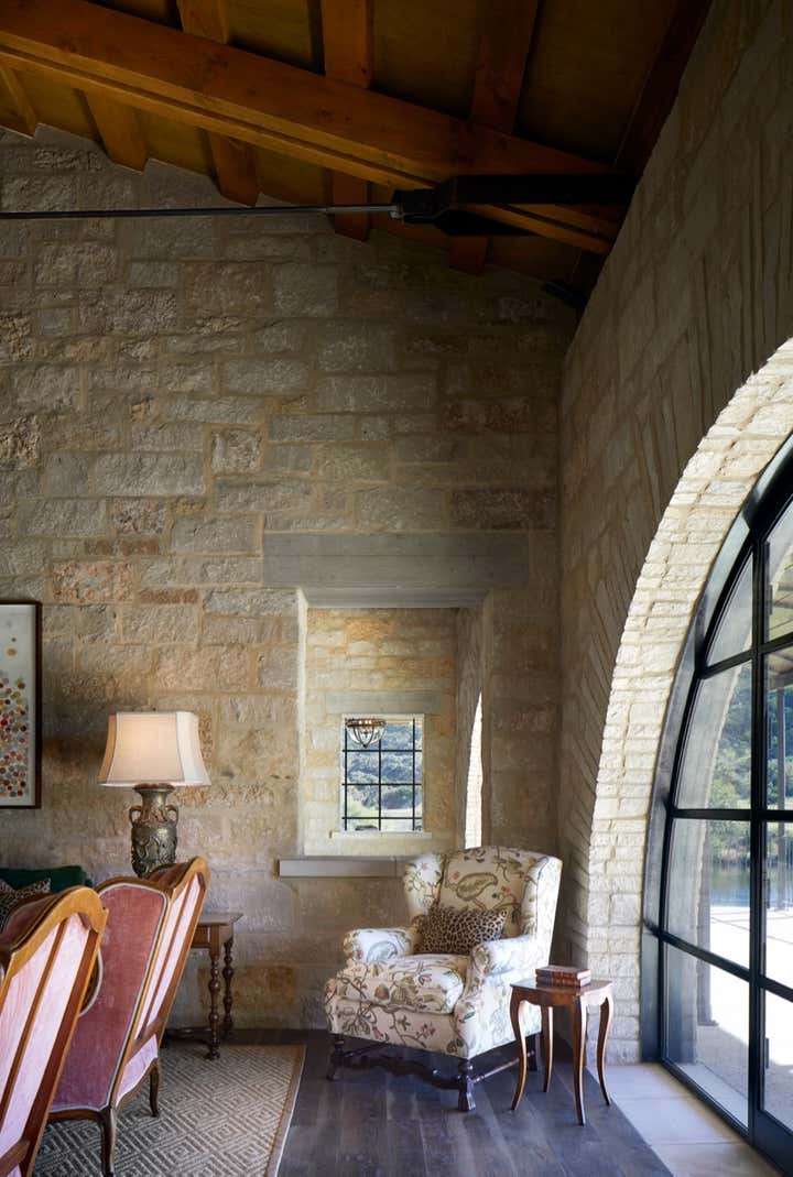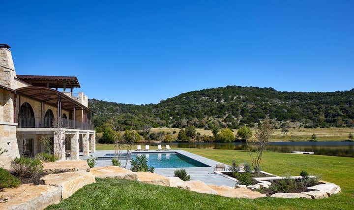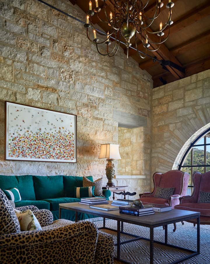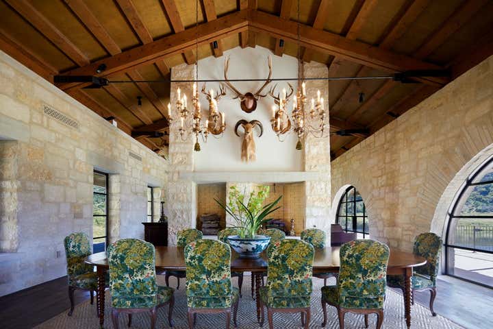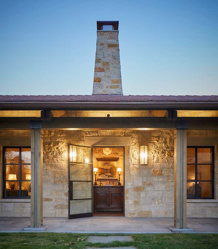 Native limestone ranch house in an idyllic setting filled with antiques and colors to bring in the outside is second home to a young family.