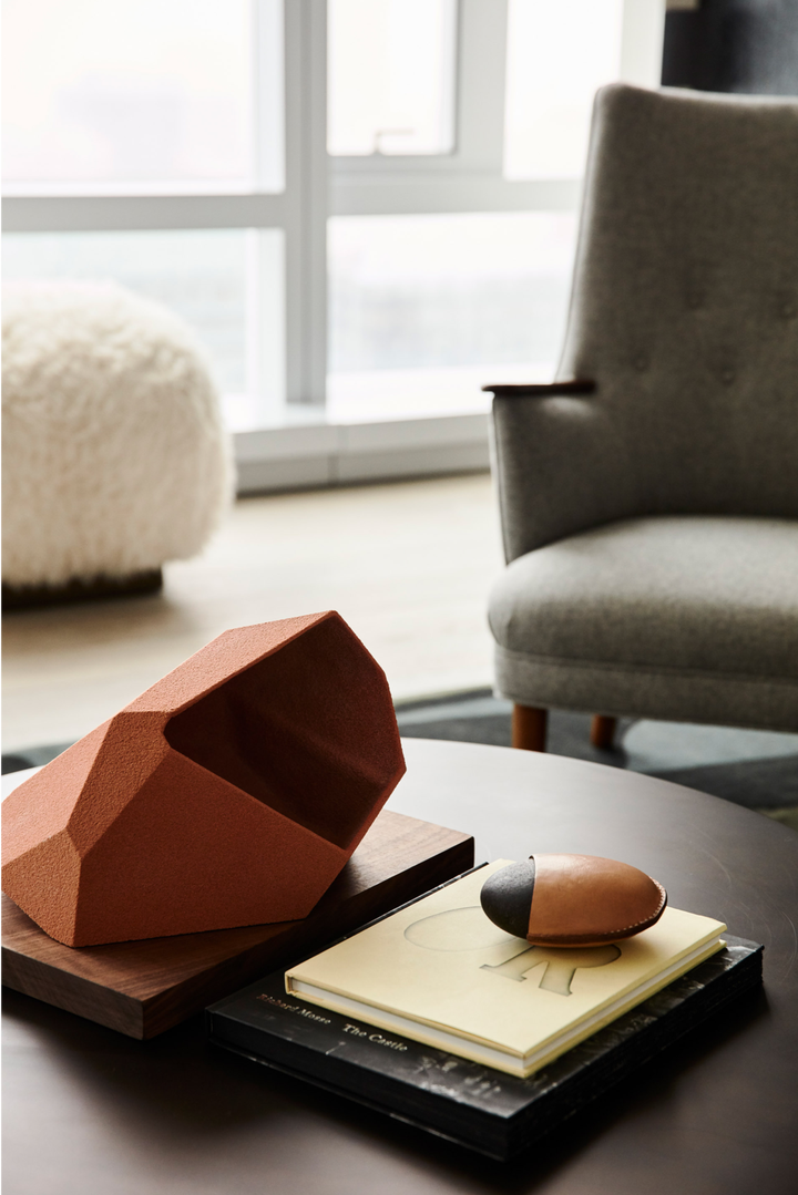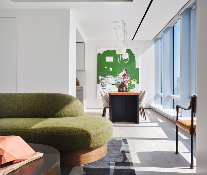 This home exudes luxe minimalism, with a worldly mix of contemporary art, custom-designed furnishings, and timeless vintage pieces. The warm, modern room settings are defined by a bold sensibility and saturated colors; grounded by natural hues and textures and deep wood tones. The art collection for this home includes contemporary painting and photography, as well as a multi-media video piece by internationally renowned artist Jim Campbell whose work can be seen atop San Francisco s Salesforce Tower, just outside the home s window. The custom dining table and master built-in headboard were designed by AubreyMaxwell and produced locally