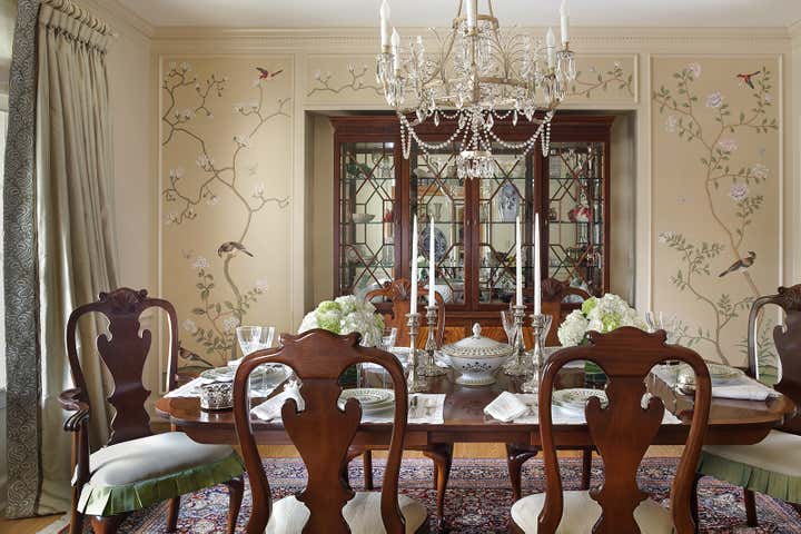 Design inspiration for this high-end, traditional dining room was informed by a study of how to achieve an aura of balance, elegance and artful refinement within the space, as well as ensuring an abundantly sufficient sense of light and the outdoors with only one window. A framed, panelized conceptual treatment of De Gournay hand-painted wallpaper defines the enduring elegance of this room and encases an arresting breakfront that centers the space while beckoning eyes upward and outward, providing both balance and drawing in the natural beauty of the surrounding garden. No detail was left unattended. The custom-colored wallpaper was carefully selected to match and complement the luxurious rug. A gracefully airy light fixture works in tandem with a monotone selection for the paint color to inspire a sense of freshness in the otherwise formal setting. The host and hostess chairs boast delightful box pleat skirts in acid green as one more subtle nuance to help draw in the outdoors and enliven the space with a sense of natural beauty.