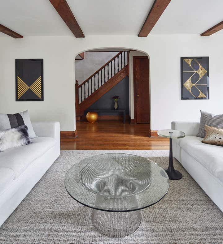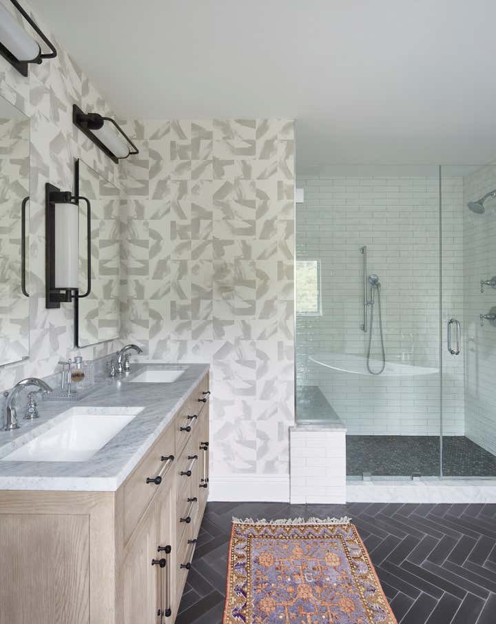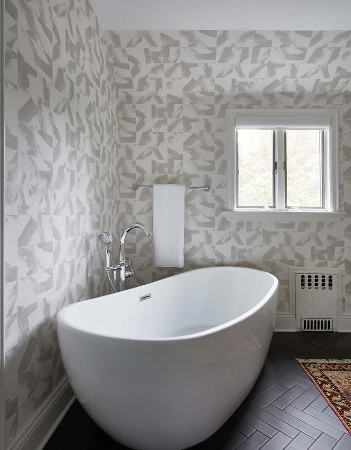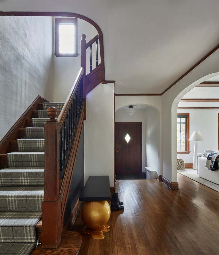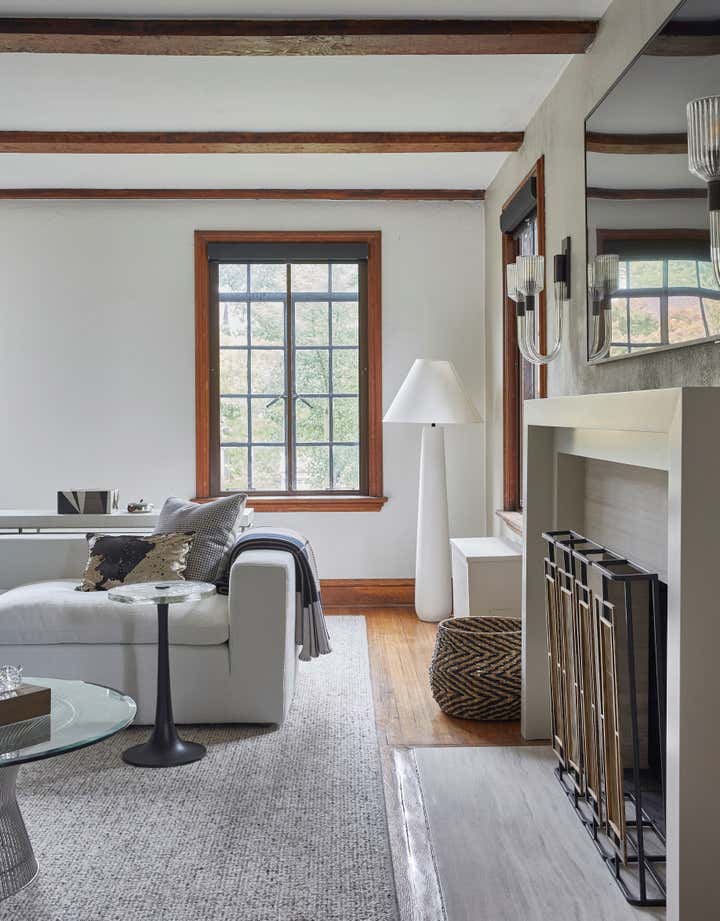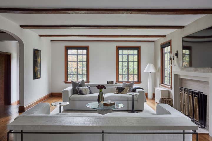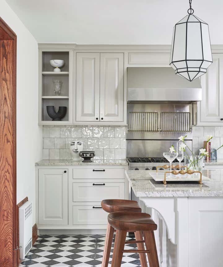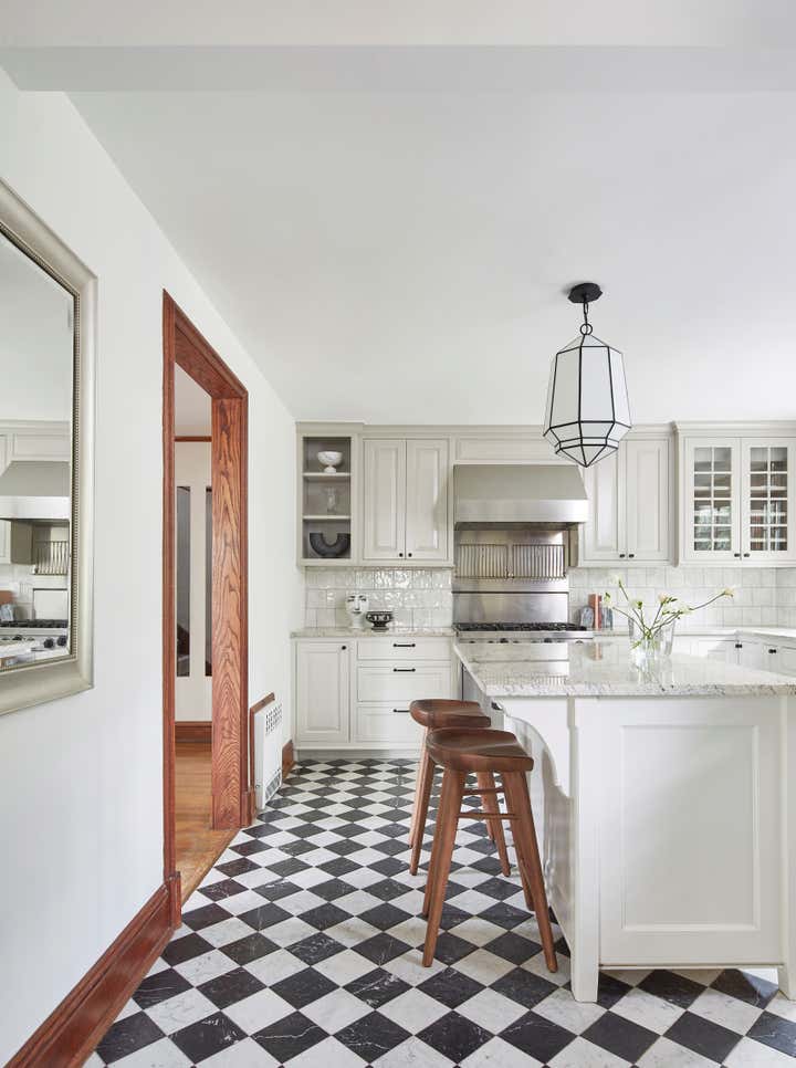 A family of three moved from an apartment in Hoboken to a lovely but old-fashioned Tudor house in Montclair, New Jersey in 2021. We aimed to breathe new life into their home while still honoring the traditional architecture. We thoughtfully selected which elements to keep (like the beautiful woodwork, kitchen floor, and cabinetry) and which elements to replace (the fireplace and the entire primary bathroom). Using the high-contrast kitchen floor as our jumping off point, we created graphic yet timeless spaces that both harmoniously flow together and stand apart. The whole-home project includes a foyer, a custom surrealist bench with metallic resin created by Mazza Collective, a gray mirror installation inspired by Sol LeWitt, powder room, living room, sunroom featuring a cantilevered window seat, kitchen, dining room, primary bedroom, primary bathroom, and office.