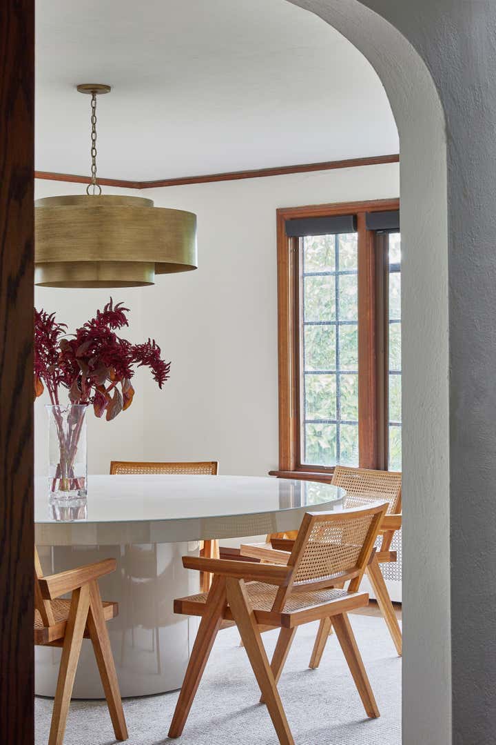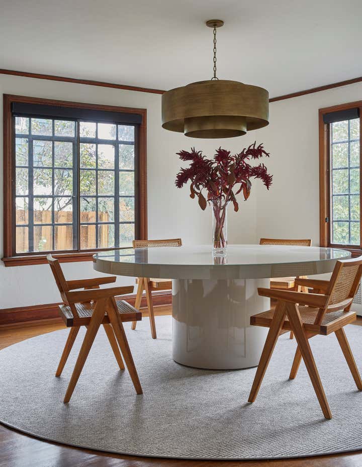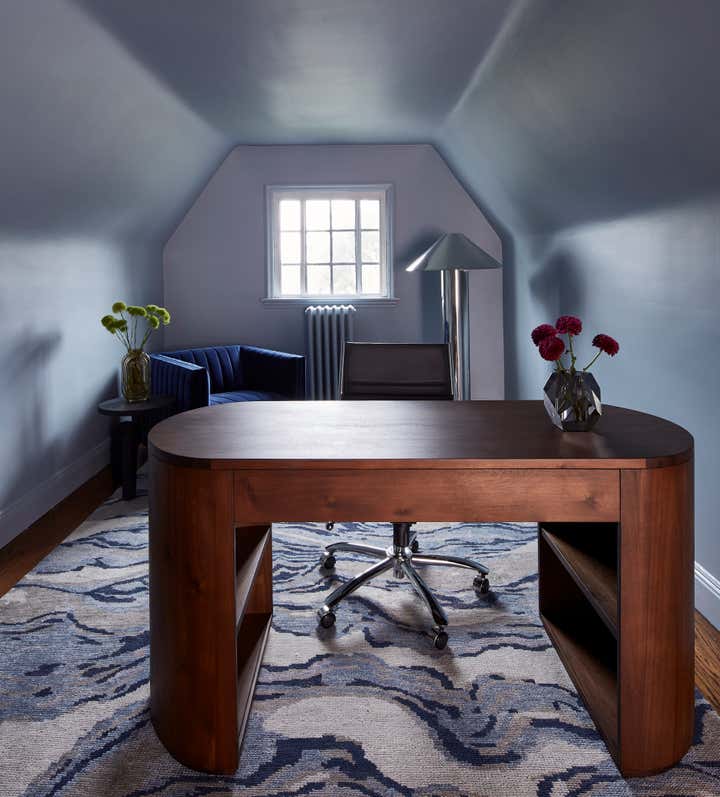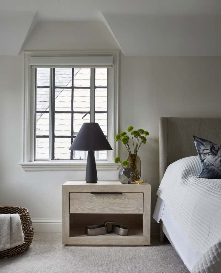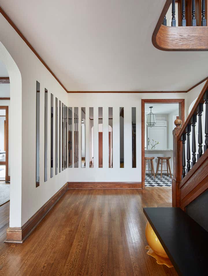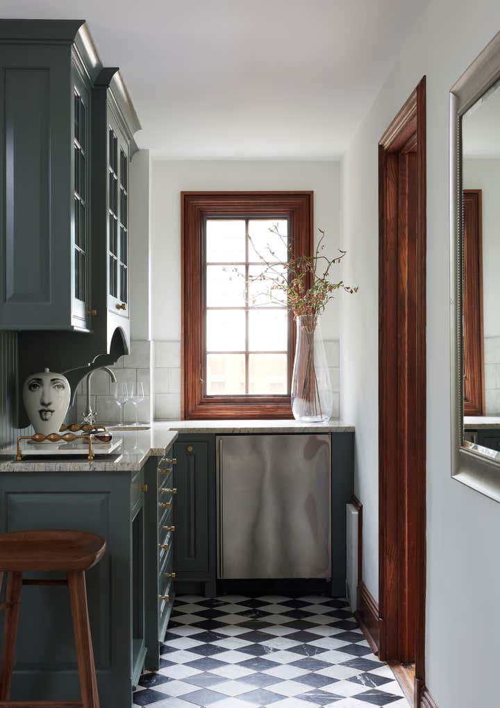 A family of three moved from an apartment in Hoboken to a lovely but old-fashioned Tudor house in Montclair, New Jersey in 2021. We aimed to breathe new life into their home while still honoring the traditional architecture. We thoughtfully selected which elements to keep (like the beautiful woodwork, kitchen floor, and cabinetry) and which elements to replace (the fireplace and the entire primary bathroom). Using the high-contrast kitchen floor as our jumping off point, we created graphic yet timeless spaces that both harmoniously flow together and stand apart. The whole-home project includes a foyer, a custom surrealist bench with metallic resin created by Mazza Collective, a gray mirror installation inspired by Sol LeWitt, powder room, living room, sunroom featuring a cantilevered window seat, kitchen, dining room, primary bedroom, primary bathroom, and office.