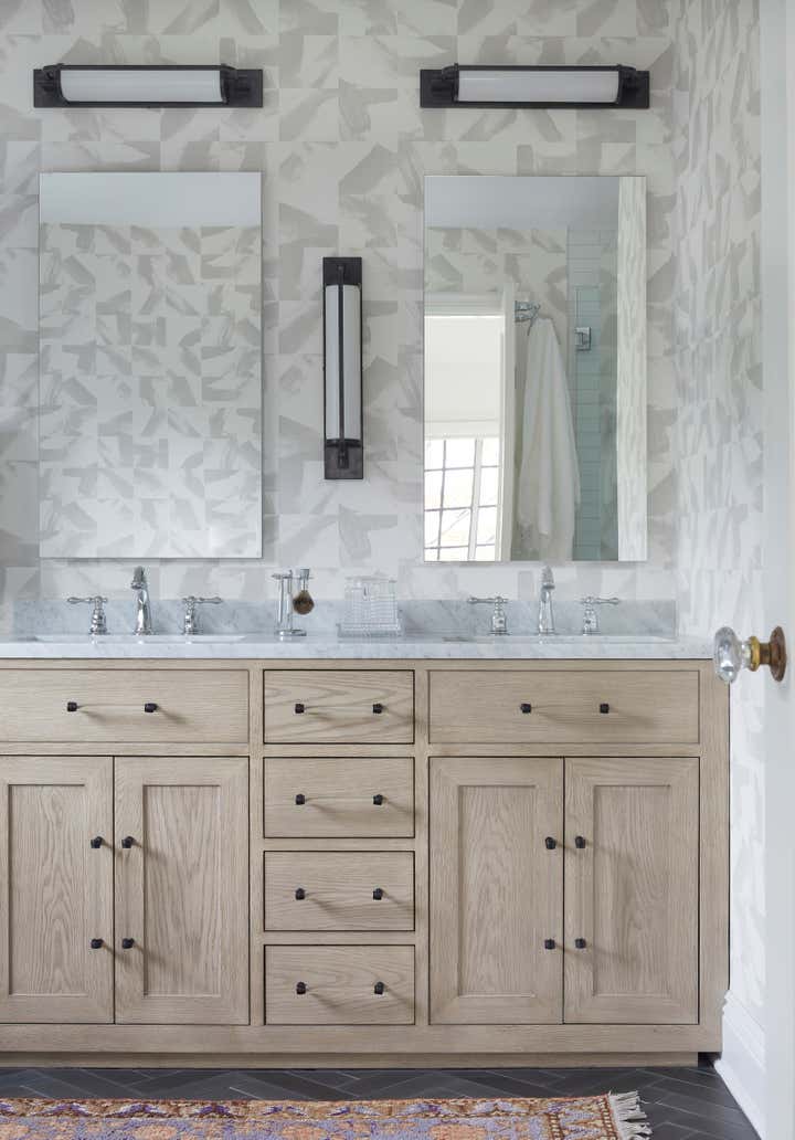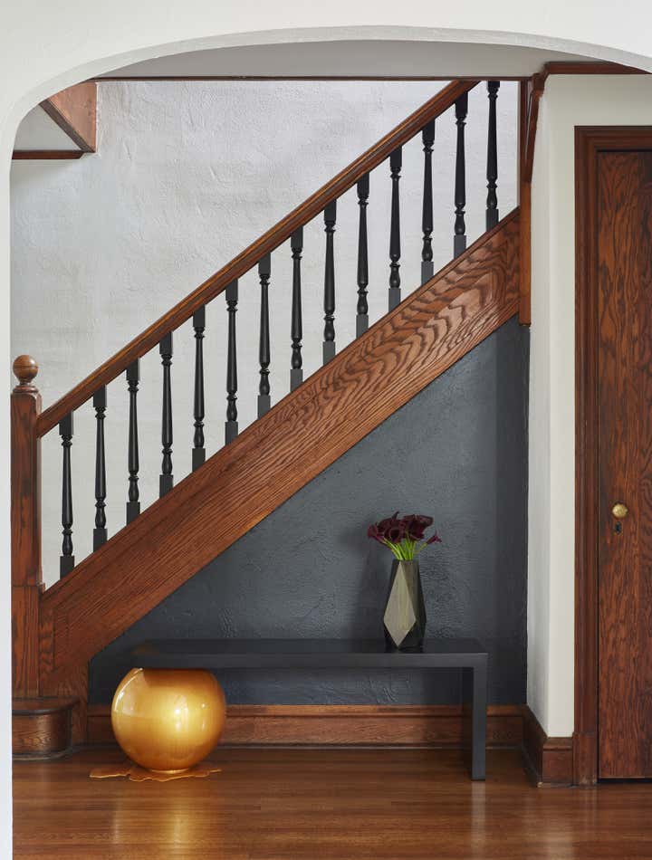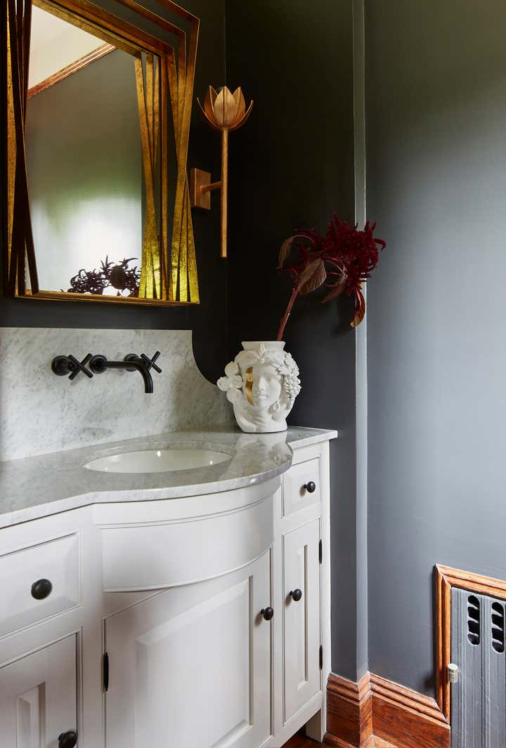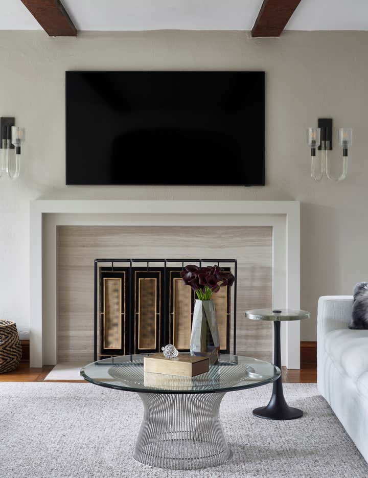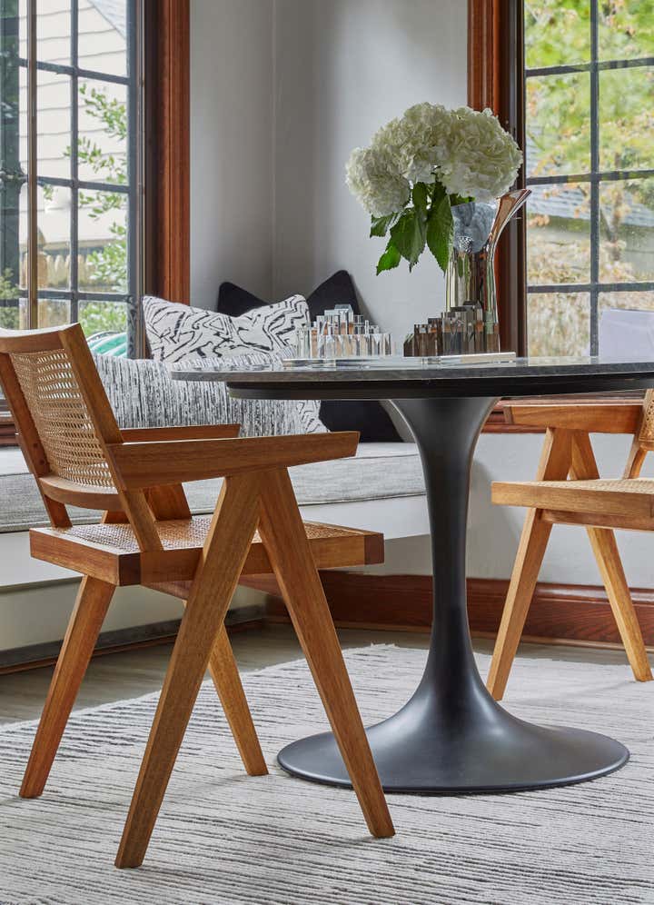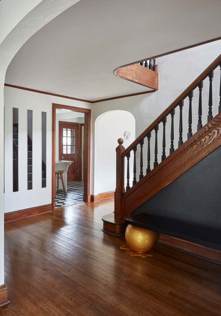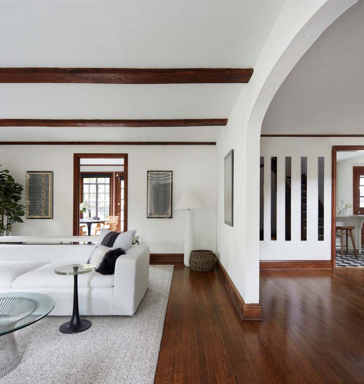 A family of three moved from an apartment in Hoboken to a lovely but old-fashioned Tudor house in Montclair, New Jersey in 2021. We aimed to breathe new life into their home while still honoring the traditional architecture. We thoughtfully selected which elements to keep (like the beautiful woodwork, kitchen floor, and cabinetry) and which elements to replace (the fireplace and the entire primary bathroom). Using the high-contrast kitchen floor as our jumping off point, we created graphic yet timeless spaces that both harmoniously flow together and stand apart. The whole-home project includes a foyer, a custom surrealist bench with metallic resin created by Mazza Collective, a gray mirror installation inspired by Sol LeWitt, powder room, living room, sunroom featuring a cantilevered window seat, kitchen, dining room, primary bedroom, primary bathroom, and office.