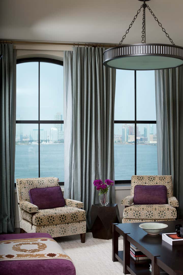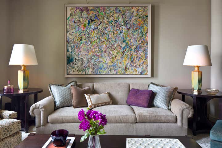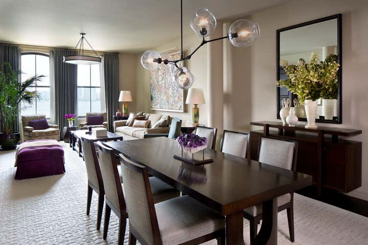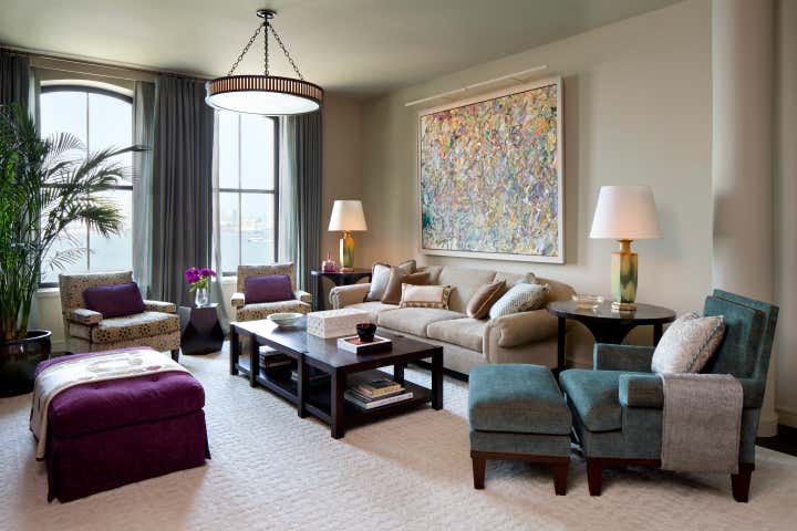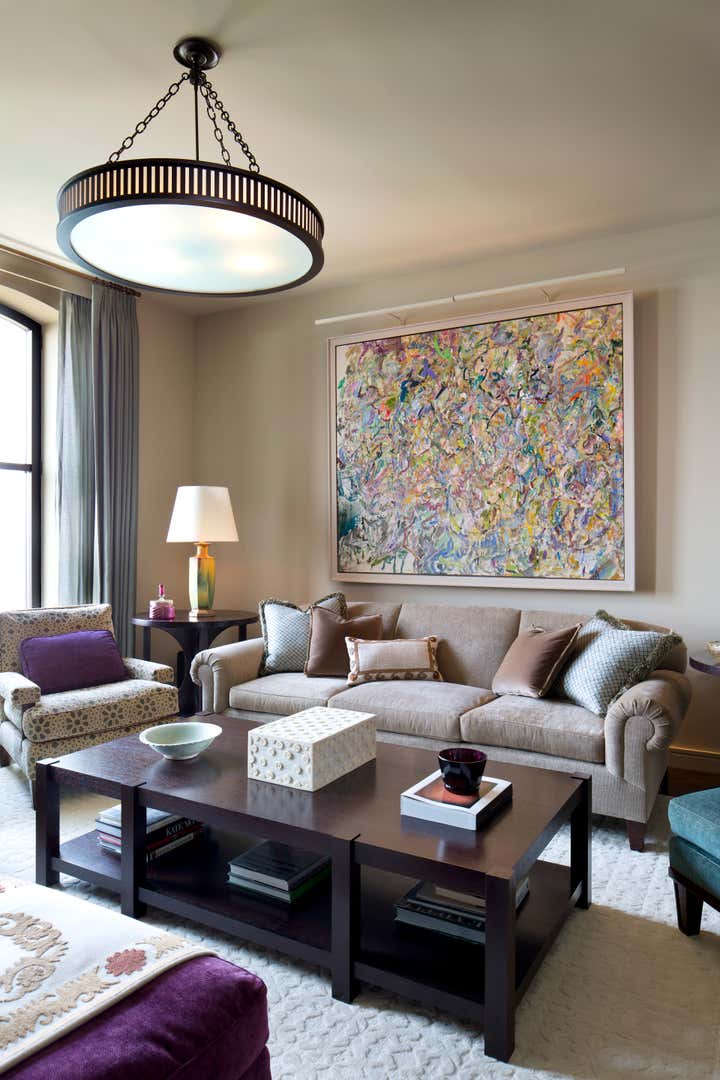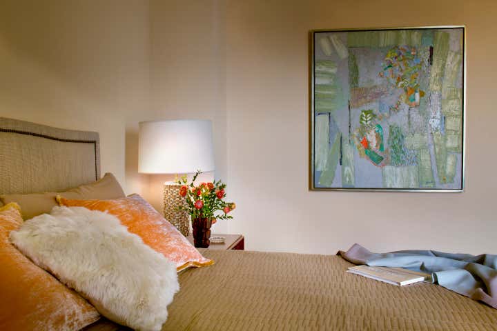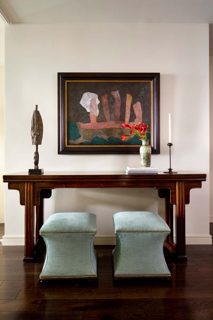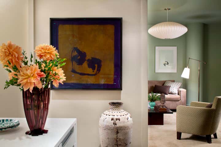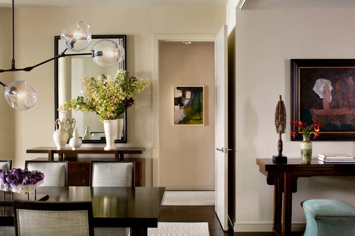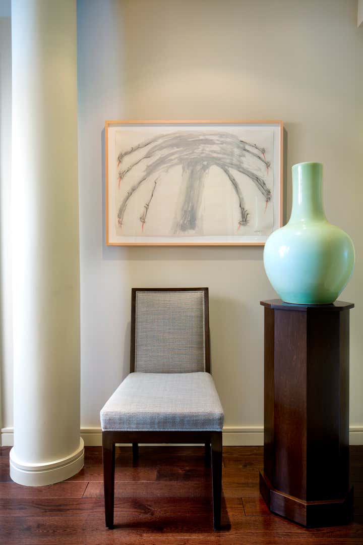Glenn Gissler Design transformed this 2,500 square-foot, 2-bedroom loft apartment in Tribeca for a family of three. Located in a freshly converted former warehouse building, the loft’s principal rooms enjoy Hudson River views and an abundance of natural light through six large west-facing windows, making the remaining walls ideal for displaying a newly acquired collection of fine art. Gissler worked with his clients to acquire a number of artworks by recognized leading American Abstract Expressionist movement artists to be placed within the calm background. A large, lively canvas by Larry Poons hangs above the living room sofa, while striking works by Theodoros Stamos and Milton Resnick are seen in the entry off the dining area.