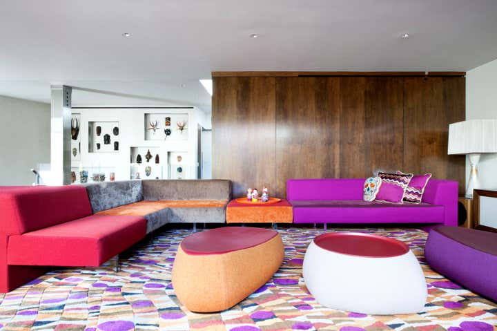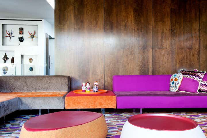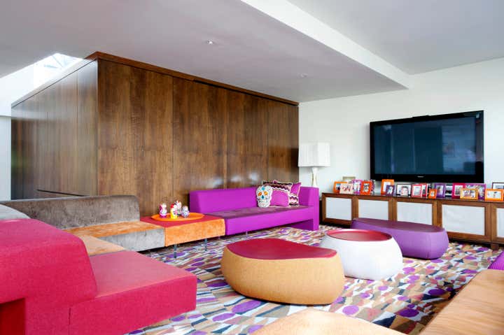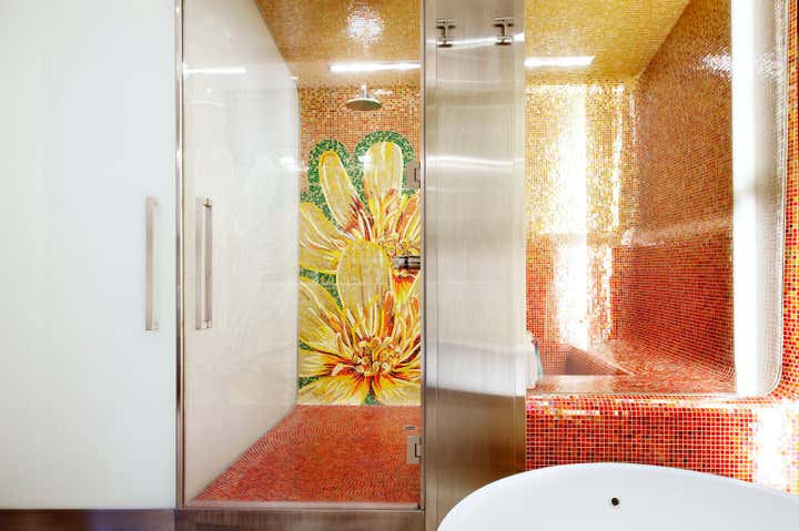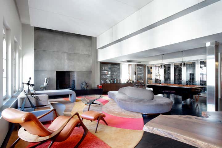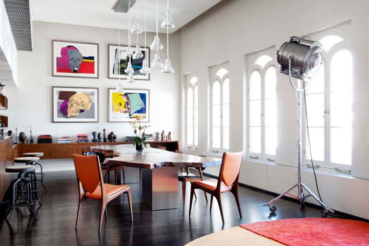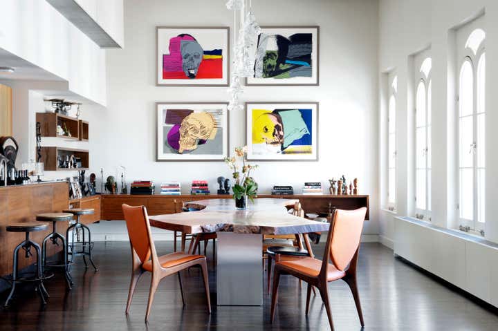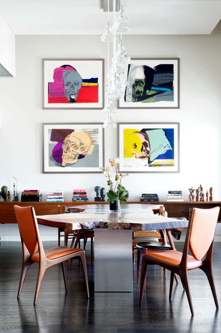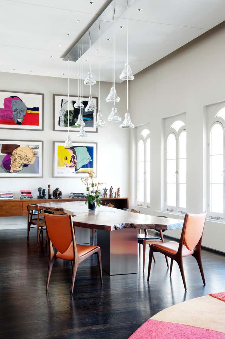 Housed in one of New York’s original cast iron façade buildings, this triplexed Tribeca penthouse features a 3,000 sq.ft. terrace and rooftop with a custom stainless steel swimming pool. When designing the interiors, the goal was to create a cool and chic family home ideal for entertaining but also conducive to a fun family life. Vibrant splashes of color, warm dark woods and bold, dynamic furniture custom designed by Vladimir Kagan were incorporated to accomplish that goal. The early purchase of four original Andy Warhol skull prints triggered the design palette for the dining room, which features a long custom live edge dining table. The master bath is modern and warm, with a Gaudi-like mosaic installation in the shower, a floating tub, and a rich walnut wall behind it. The space also features pieces by Edward Fields, Tom Dixon and Missoni. Architecture: David Howell and Steven Wakenshaw Interior Design: Steffani Aarons