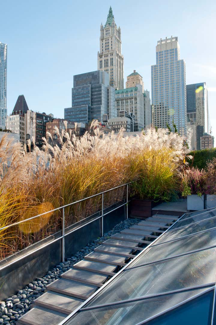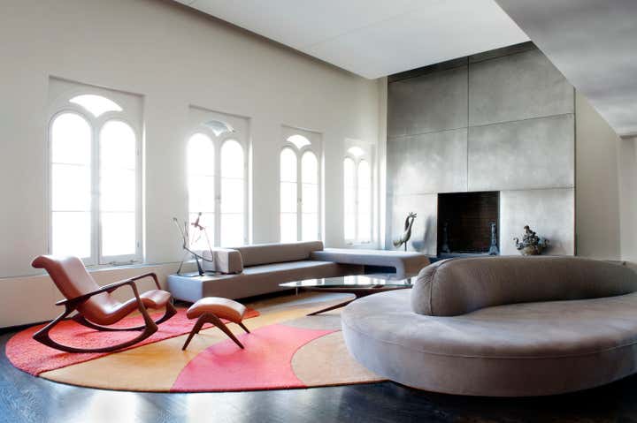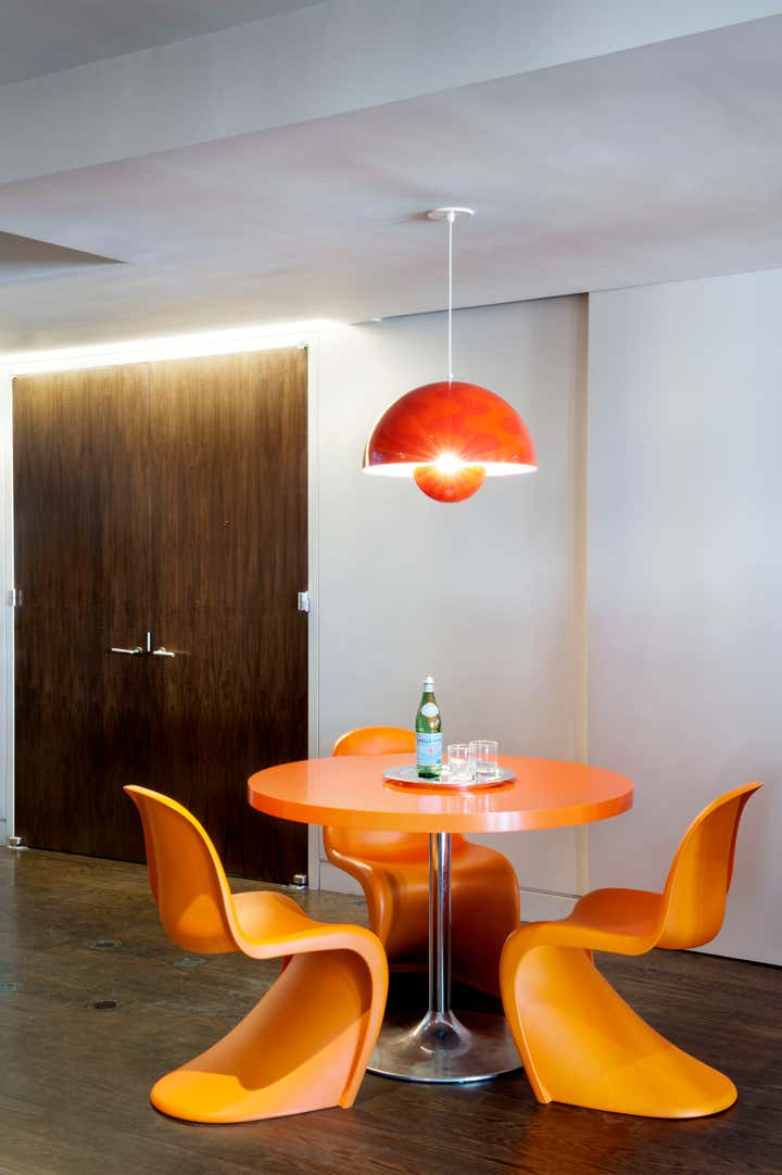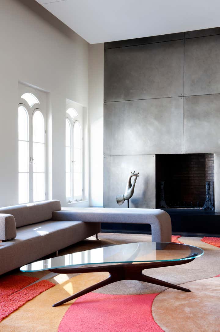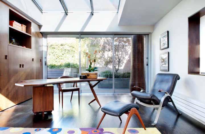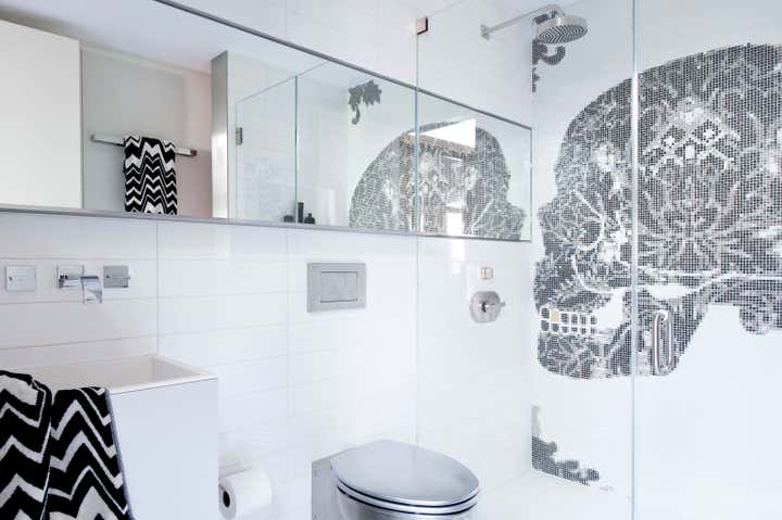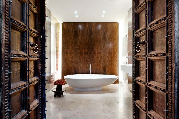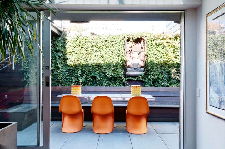 Housed in one of New York’s original cast iron façade buildings, this triplexed Tribeca penthouse features a 3,000 sq.ft. terrace and rooftop with a custom stainless steel swimming pool. When designing the interiors, the goal was to create a cool and chic family home ideal for entertaining but also conducive to a fun family life. Vibrant splashes of color, warm dark woods and bold, dynamic furniture custom designed by Vladimir Kagan were incorporated to accomplish that goal. The early purchase of four original Andy Warhol skull prints triggered the design palette for the dining room, which features a long custom live edge dining table. The master bath is modern and warm, with a Gaudi-like mosaic installation in the shower, a floating tub, and a rich walnut wall behind it. The space also features pieces by Edward Fields, Tom Dixon and Missoni. Architecture: David Howell and Steven Wakenshaw Interior Design: Steffani Aarons
