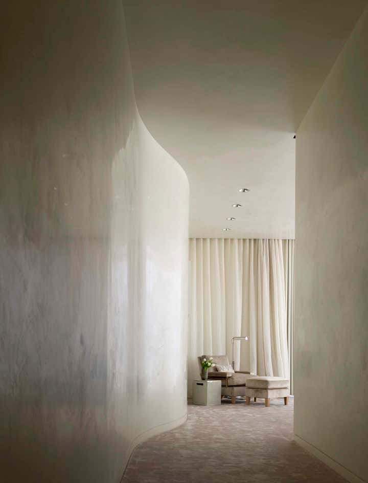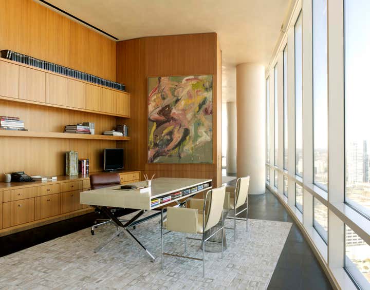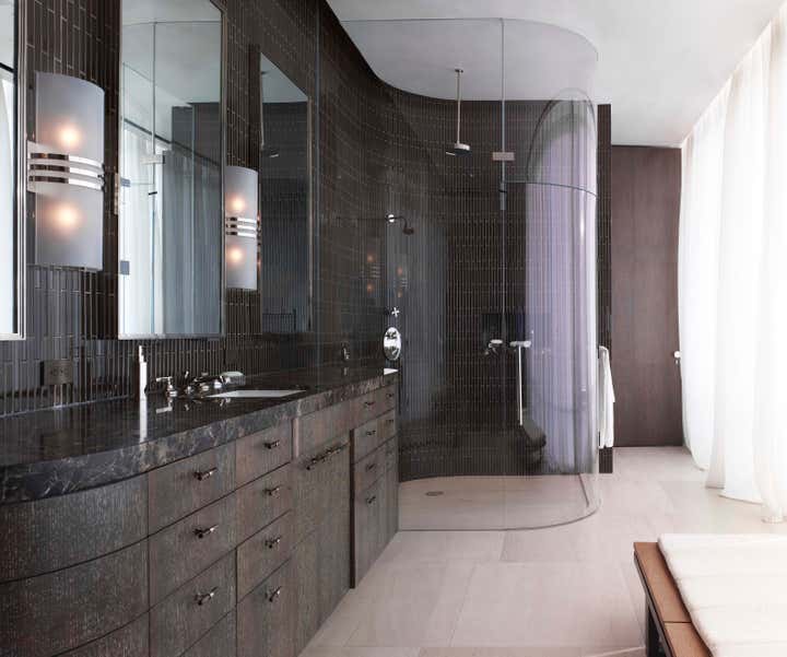 Sitting high in the Dallas sky, the W Penthouse is elegant and refined. The curved plaster walls, soft-toned limestone and oak flooring create a tranquil backdrop to view the Dallas city skyline. These views, including buildings by Rem Koolhaus, IM Pei and Norman Foster are also graced by two beautiful Santiago Calatrava Bridges on the south western side of the home. The central corridor leads to several metal-framed doors with pixilated glass panels that ombre from opaque to transparent. These doors, beautiful and functional, slide shut to create more intimate spaces or open to create a flowing, spacious environment, perfect for entertaining.