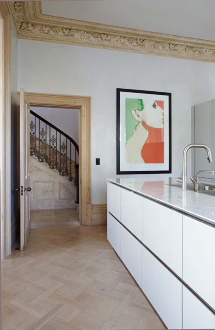 A beautiful stucco fronted house with stunning architectural details such as hand carved cornicing and stone staircase. The many layers of paint were stripped back to revealed the warmth of the original timber and the beautifully decorative cherub embellished plasterwork. This was the starting point for the refurbishment. There is a fine balance between old and new with a contemporary kitchen, comfortable furniture and mid century pieces.
