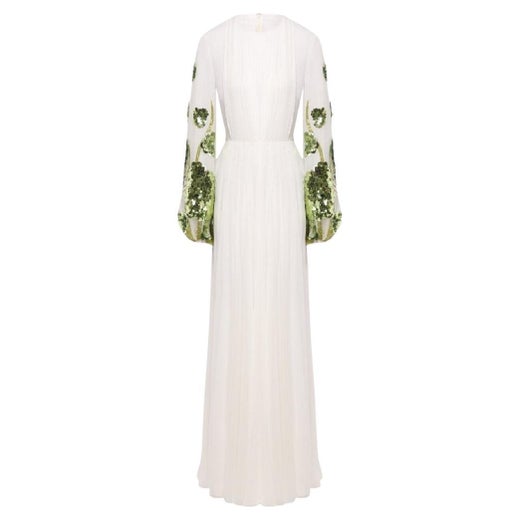 As a fashion house, Valentino is best known for its signature Valentino Red color, though one of its iconic lines is the monochromatic “no colour” collection for which the designer won the Neiman Marcus Award in 1967. (The collection also debuted his trademark “V.”) The white dresses and beige dresses led to a demand for Valentino wedding gowns, with clients including Elizabeth Taylor, Jennifer Lopez and Anne Hathaway.