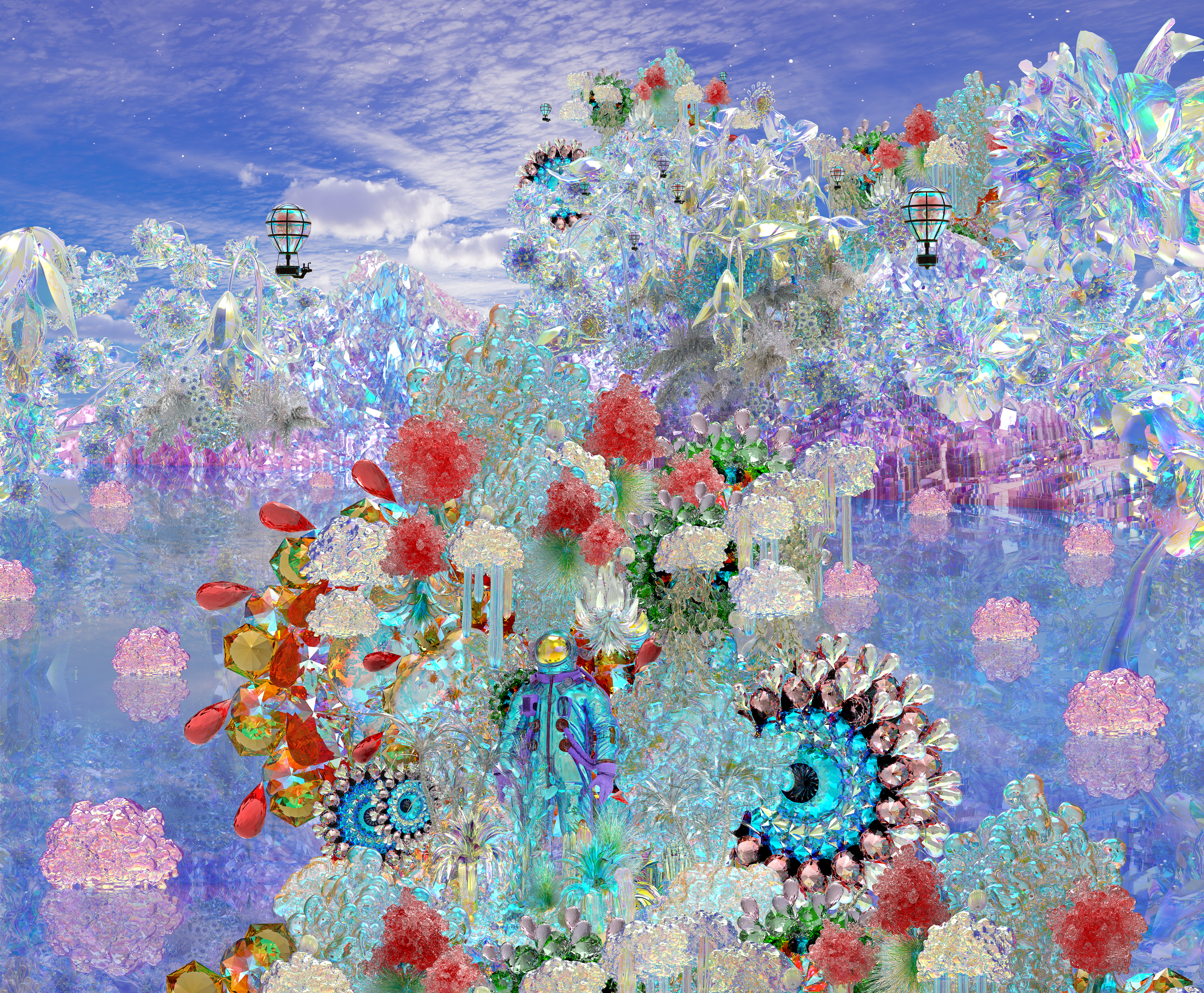 AETHERIUS is a realm in the sky shaped by faceted terrain and kaleidoscopic vegetation. I envision the abundance and tranquility that nature brings. Despite its vibrant surroundings, it is a place of reflection and solitude.