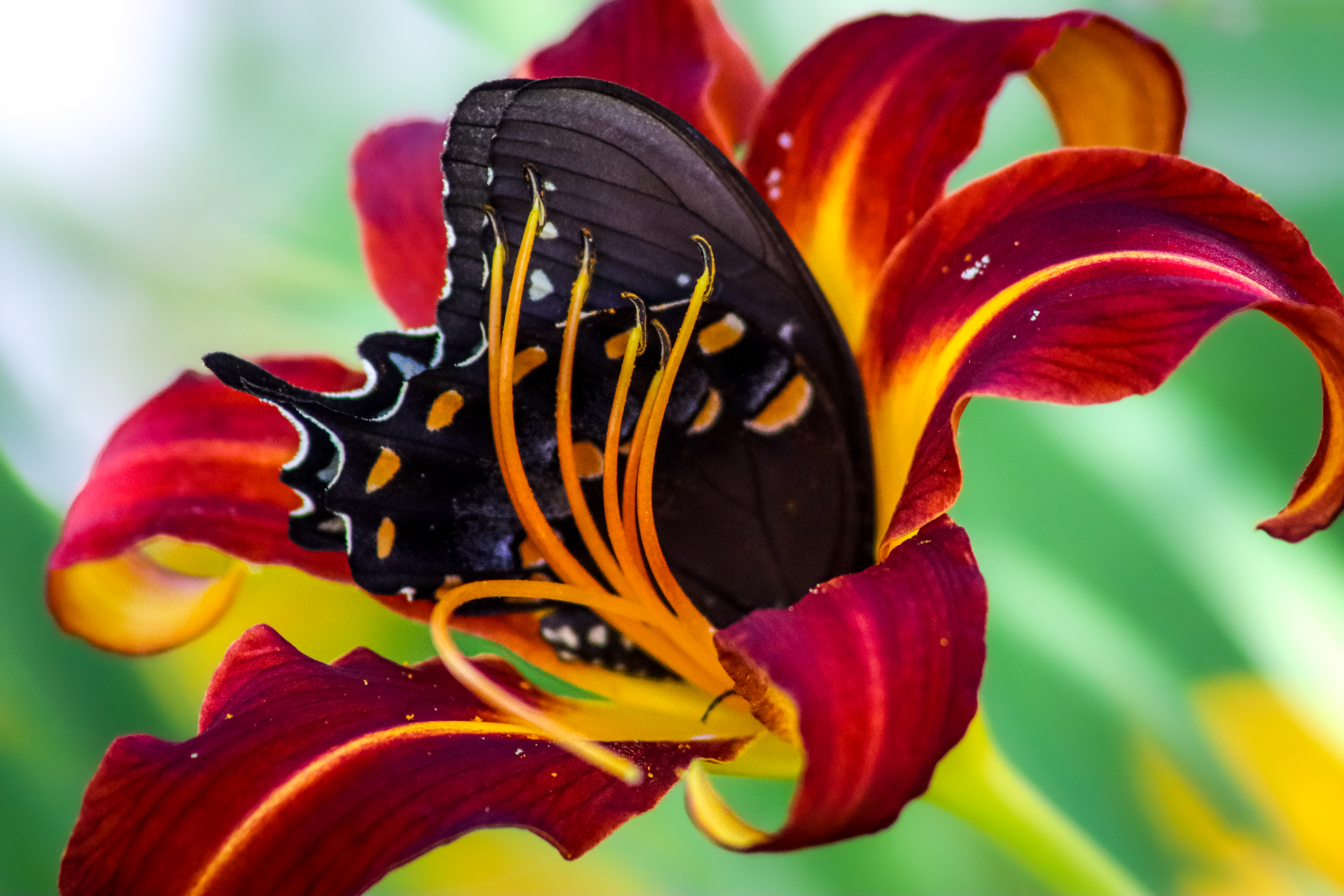 A spicebush swallowtail dives deep into one of my garden daylilies during the summer of 2020.