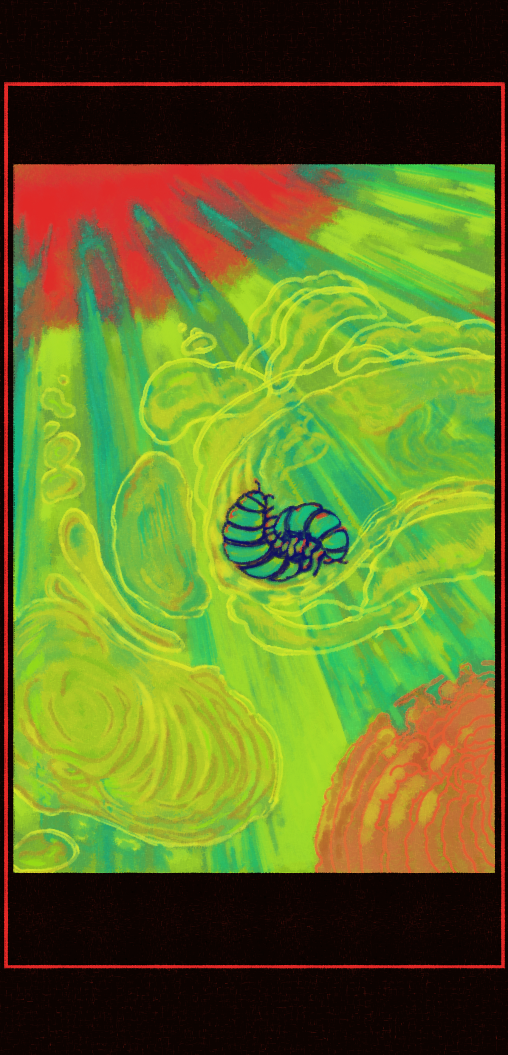 The work features three digital paintings inspired by the beginning of a lost poem. The first painting examines the idea of future in two animals inside a den, seemingly awakening by the red explosion s light. The second painting is the self, me, observing and reacting to the world. The third painting is the self dreaming the purest dream: to fly encompassing the physical constrains. Dolce avvenire! Questo ventre aperto, sono io. Sweet future! This open belly, it s me.