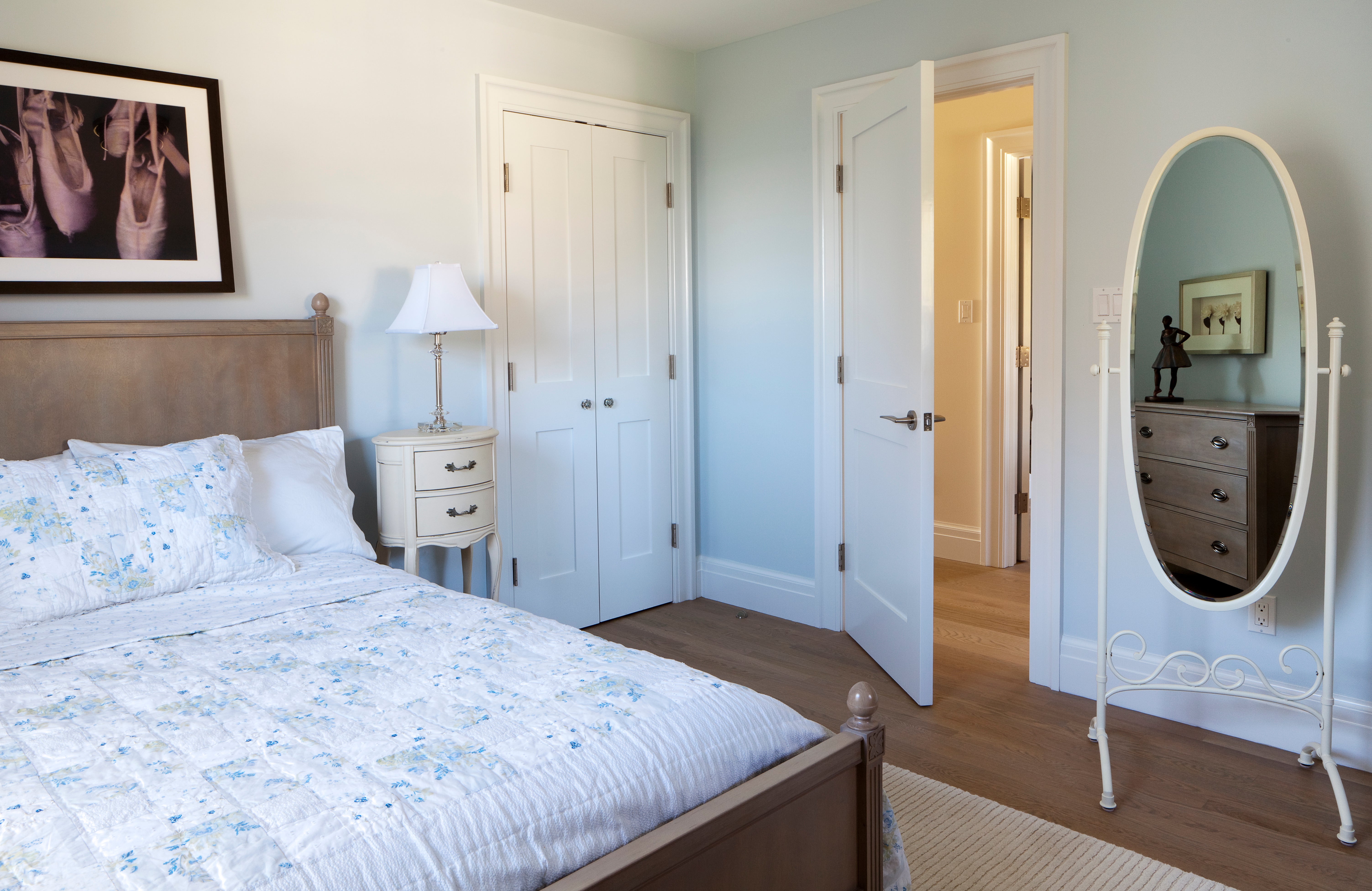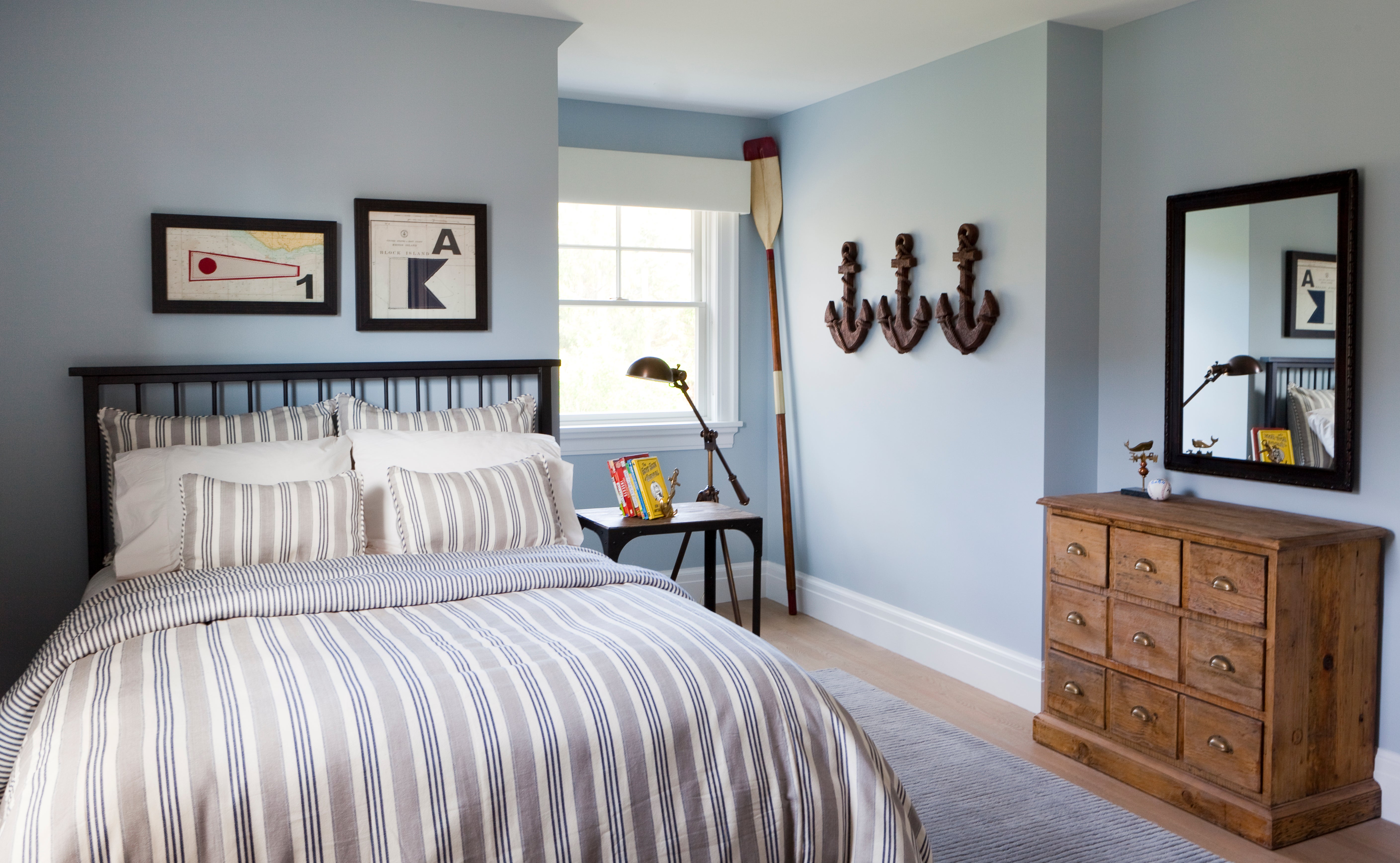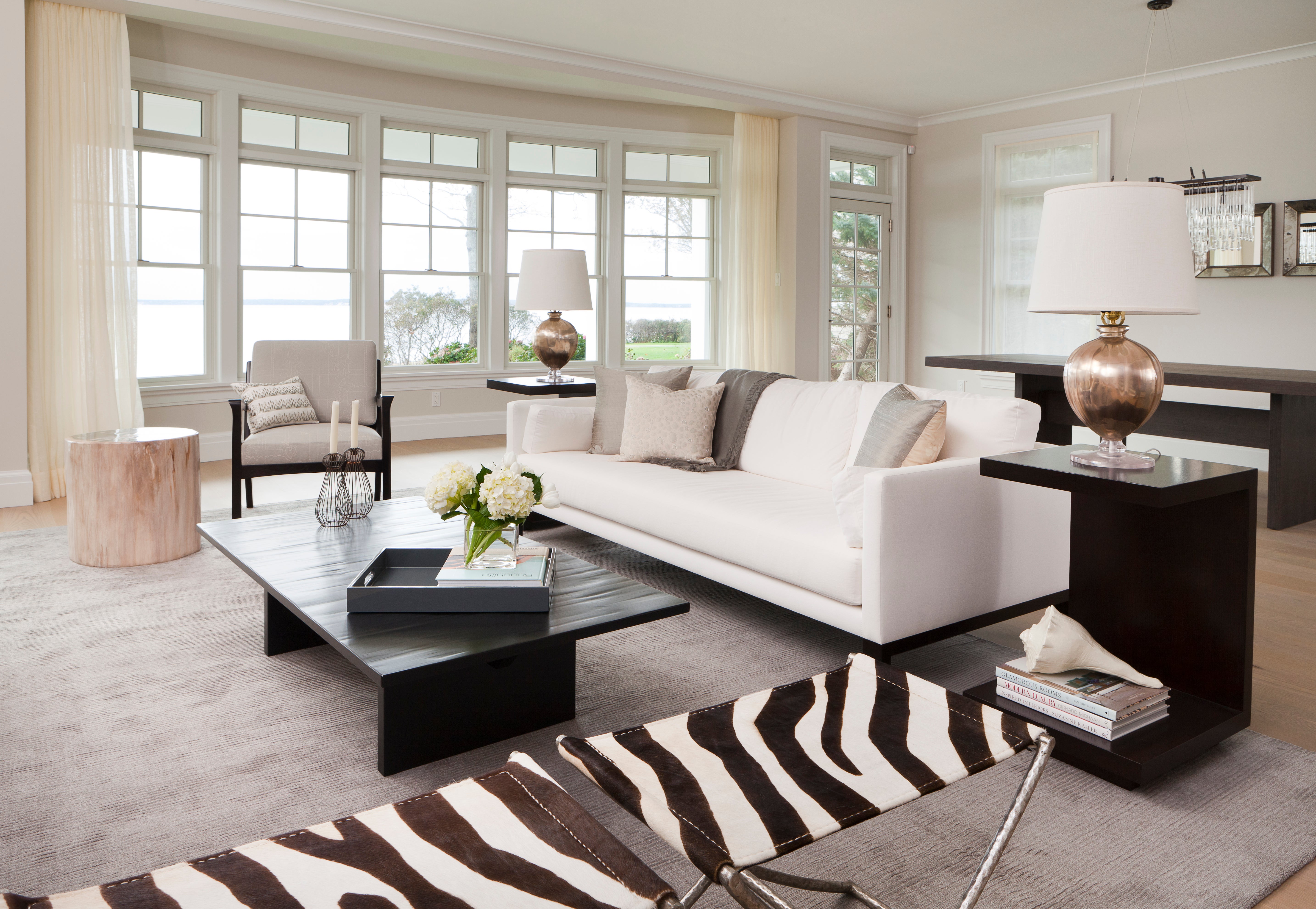 Flooded with light, the living room’s spare cream and gray palette plays nicely against the dark wood tones used throughout. A pair of zebra print stools bring a bold pattern into the room. The master bedroom is a peaceful sanctuary filled with calming tones and refined furnishings. Whimsical details in a dreamy girl’s bedroom and a nautical-inspired boy’s room round out this charming coastal retreat.
