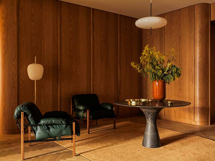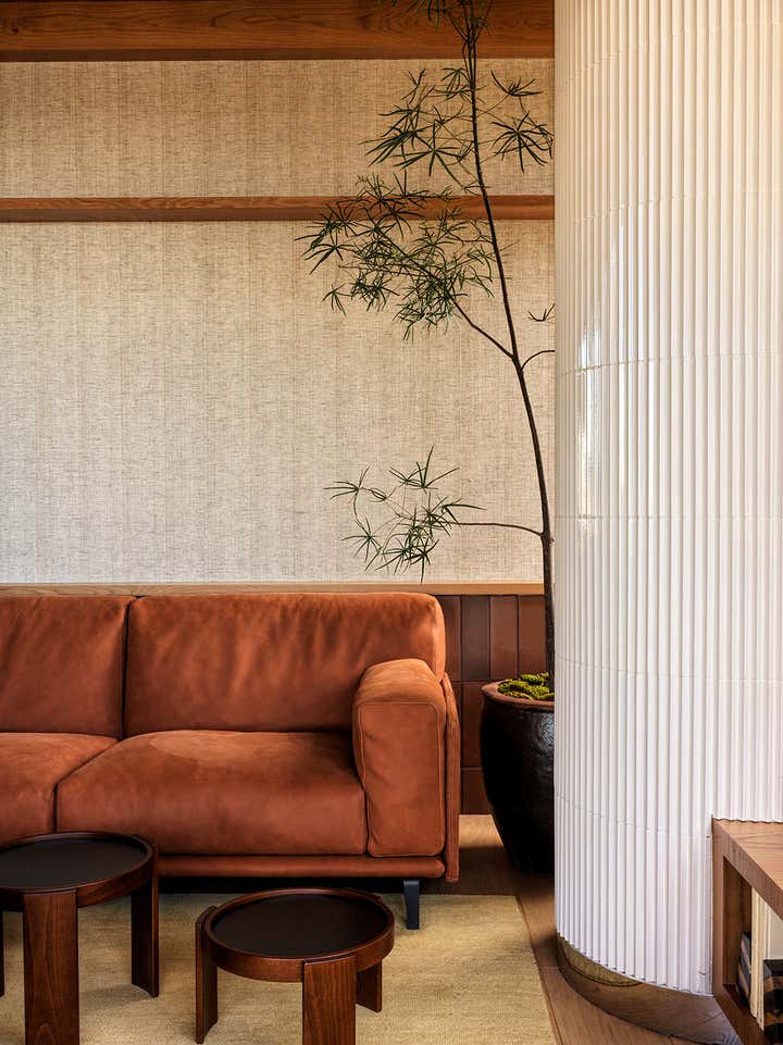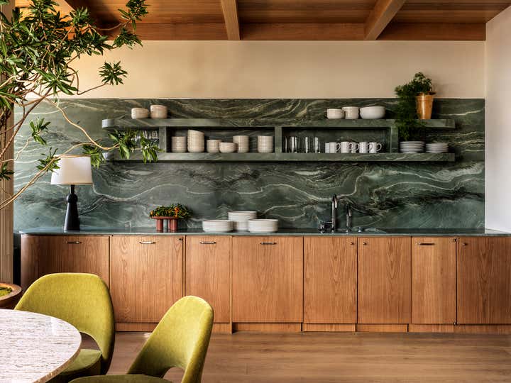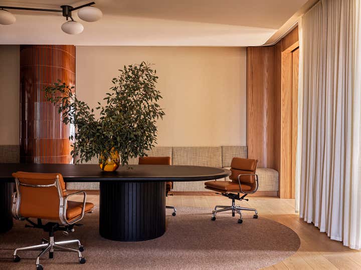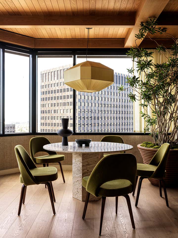 The Century City Law Office in Los Angeles, California is home to a well known entertainment law firm designed by Annie Ritz and Daniel Rabin of And And And Studio. With an impressive Hollywood client roster the firm is consistently among Los Angeles’ top entertainment attorneys. The client required more than 30 private offices and as a result, many of the existing partners would have to accept a smaller private space more in line with a modern, open office layout. The trade off to slightly smaller private offices was that Ritz and Rabin were able to design unique, inviting and functional communal spaces. The 70s-inspired design transcends through warm wood tones and bold-hued gold and green fabrics. This goal was met with several challenges due to the pandemic, creating delays and changes, specing and re-specing products, all while balancing a tight timeline.