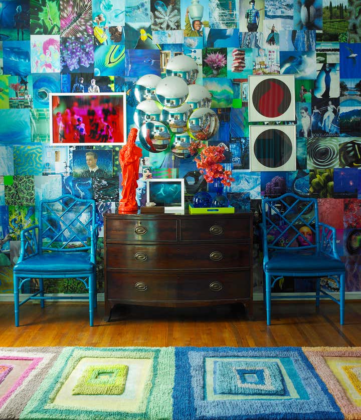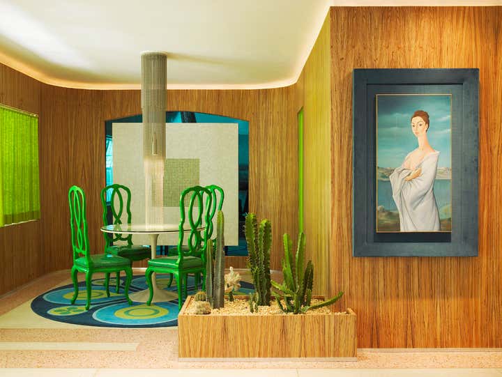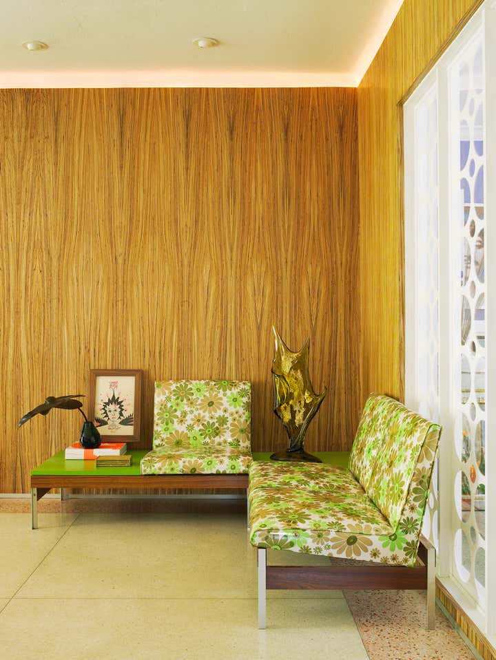 This house is a perfect example how Meyer creates backdrops. The walls of the living and dining room are sheathed in zebra wood – Meyer built out the walls slightly to accommodate subtle and dramatic up lighting into the cove ceiling which allows the light not to cast strange shadows and creating a magical glow to the space. The dining room walls are curved which creates a very sexy and intimate space. The 1960s chairs were painted and upholstered in the same lime green color in patent leather become very sculptural – the chandelier designed by Meyer gives the effect of falling water. The Master Bedroom walls took Meyer 6 months to create – collecting all the right images in the right colors then mounting them one by one – to create a backdrop which sets the tone for the room – the room has this wonderful water feel – almost like you have entered into a fish tank.